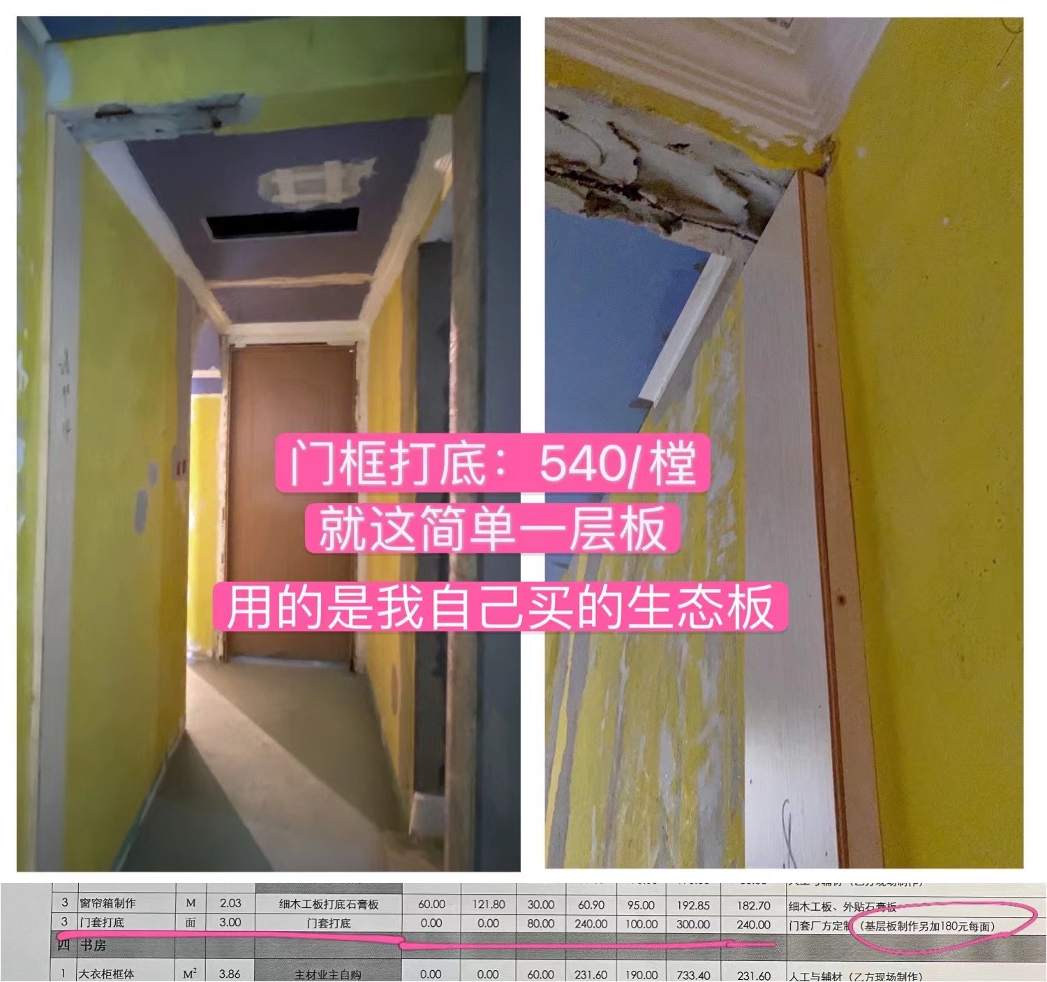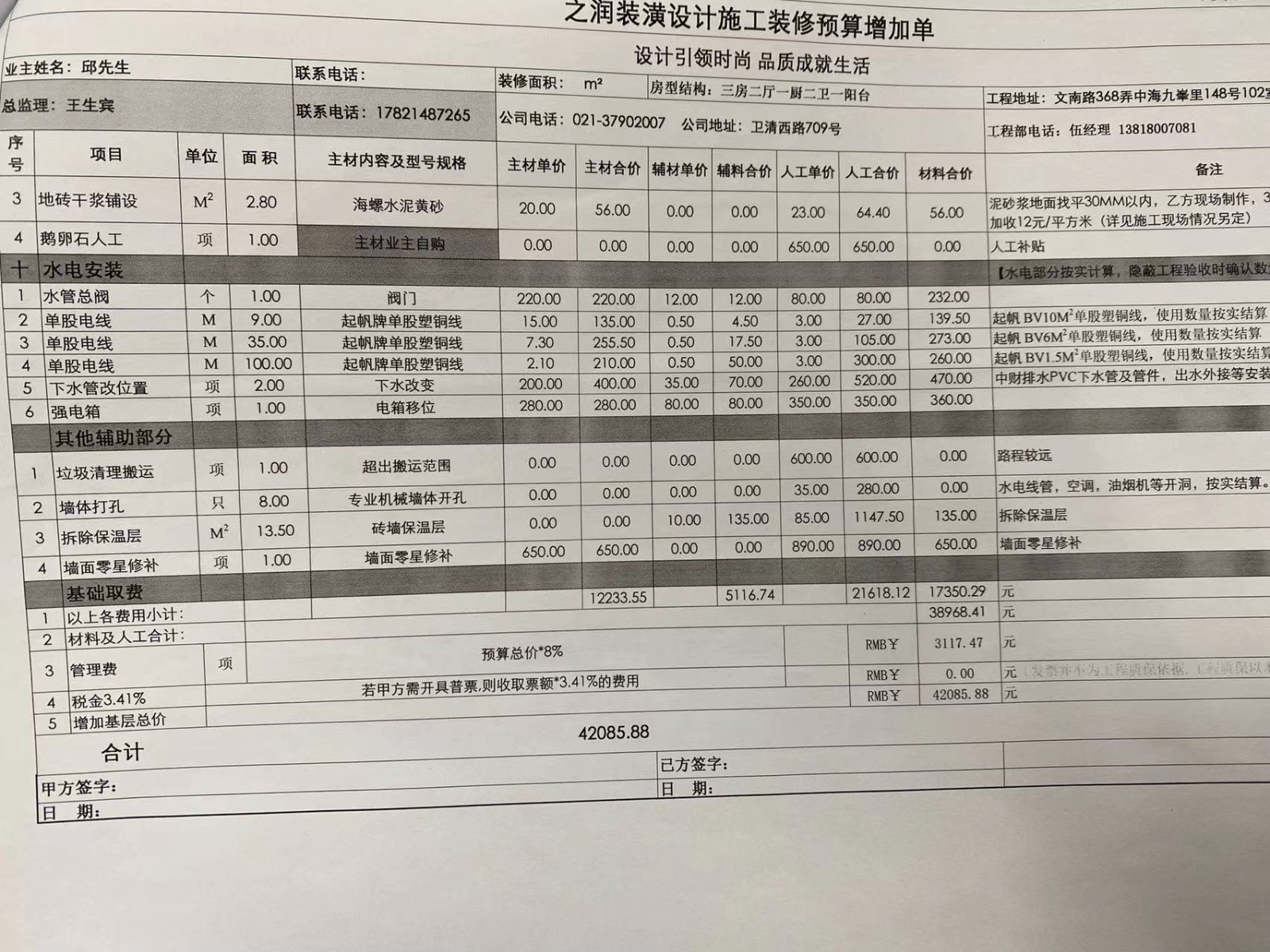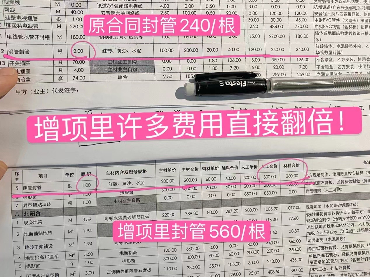 四、惡意增項,費用遠超市場正常價格。該公司的增項單足足4頁,很多未知的增項,且除柜子和南陽臺以外,都未按合同提前向甲方(本人)確認變更的施工內(nèi)容。包括且不限于地面抬高10厘米、拆保溫層、門套打底等項目。且收費夸張,例如門套打底,在使用本人自購的兔寶寶生態(tài)板作為主材的情況下,仍收取540元/樘。門口石膏板柜子(約0.9平米)按“個”收費1520元。鵝卵石人工收650/項(工時約2小時,有本人購買鵝卵石后,運回工地現(xiàn)場的時間記錄證明)。墻面零星修補收1540/元。沒有依據(jù)和單價說明。