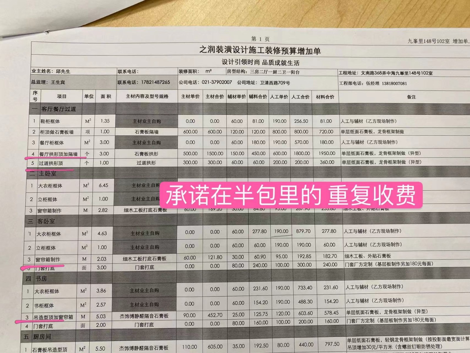 三、裝修公司出爾反爾,違背承諾。在簽合同時,設計師張曉旭制作的半包預算單,比較粗糙簡單。當時本人已明確要求做5個拱門,在微信上和設計師溝通中,他明確表示,拱門和窗簾箱部分是包含在半包預算內(nèi)的,他已經(jīng)將這些內(nèi)容計入石膏板吊頂部分,之后不會額外收費(此承諾有張曉旭的明確語音承諾和通話錄音證明?。?。然而在11.30收到增項單后,本人發(fā)現(xiàn)拱門和窗簾箱重復計算了,并且未按照市場價(以面積或長度計費),而且以遠高于市場價的“個”“項”進行自定義收費。