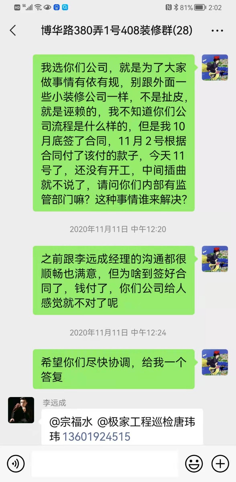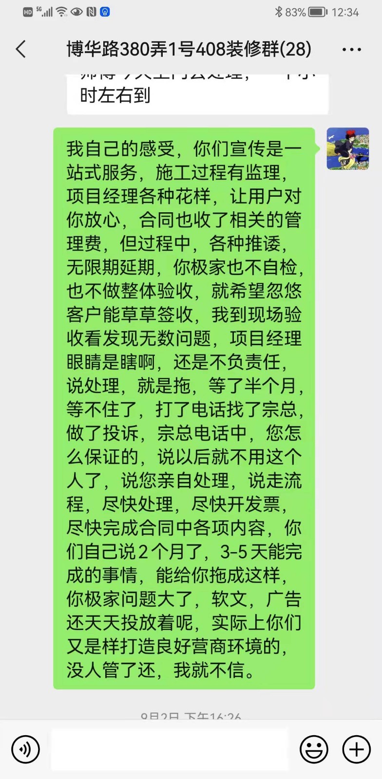 4. 不按合同履行義務(wù),中間項(xiàng)目經(jīng)理的各種不專業(yè)行為,可圈可點(diǎn),職責(zé)范圍內(nèi)的工作不上心,但為了增加一些額外收費(fèi),煞費(fèi)苦心,及其不專業(yè)要求極家內(nèi)部處理,從未直面問(wèn)題,就是打太極,合同規(guī)定內(nèi)附帶需提供產(chǎn)品,缺少項(xiàng)一直追要,拒不履行,也沒(méi)說(shuō)法。