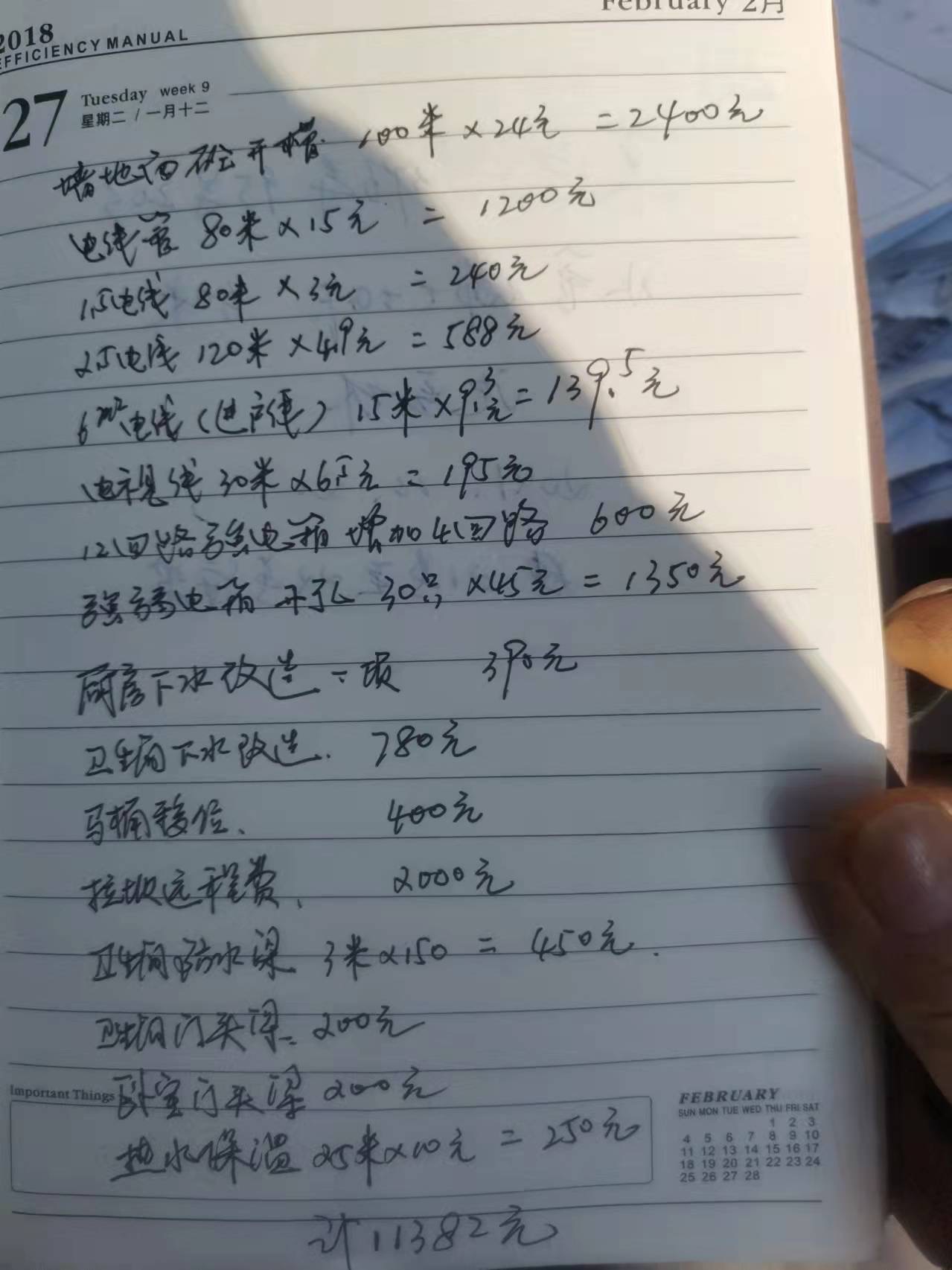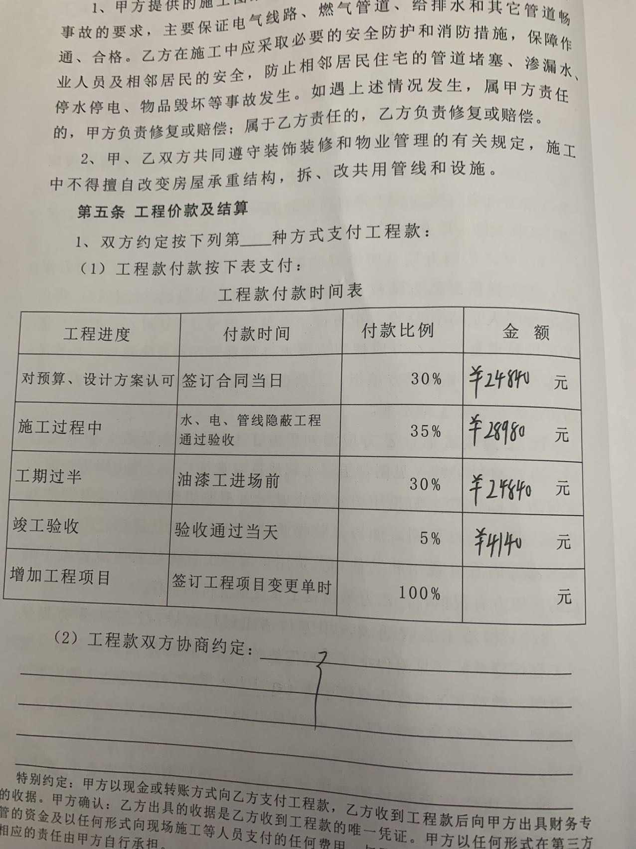 目前我們已經(jīng)付了兩期工程款,第一期24840元,第二期工程款28980元,目前僅完成拆舊和水電,其余項目均未開始。