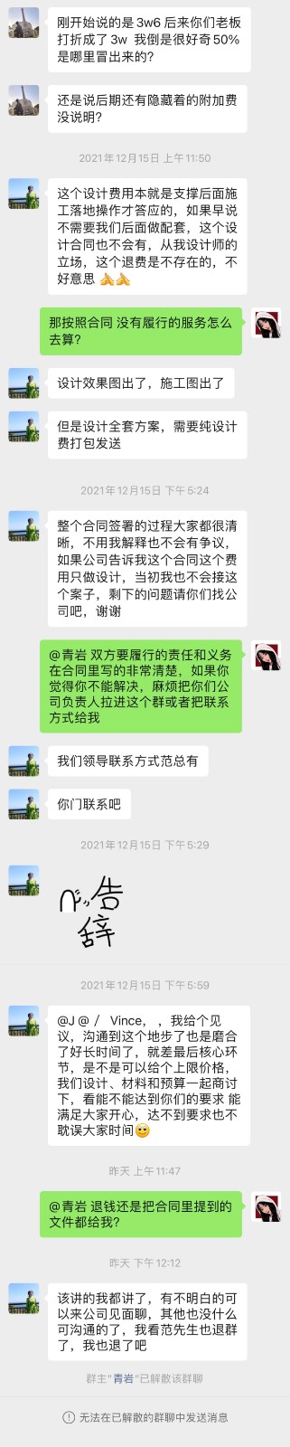 協(xié)商過(guò)程中,我給出的方案是①退款②將合同中提到的圖紙打包給我,但對(duì)方設(shè)計(jì)一開(kāi)始不承認(rèn)且稱(chēng)我們只付了設(shè)計(jì)款的50%,我回復(fù)已按照合同全款付清,50%是否還有其他隱藏款項(xiàng)沒(méi)有說(shuō),她便轉(zhuǎn)移話題。之后我再次確認(rèn)兩種方案她想選擇何種來(lái)解決,對(duì)方設(shè)計(jì)已解散溝通群,拒絕正面解決問(wèn)題。