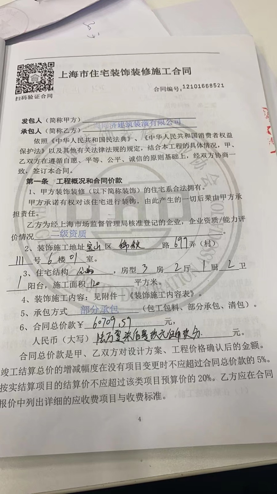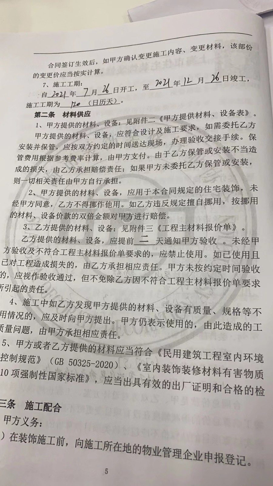 合同里寫明:21年7月26號-21年12月26號,預計工期5個月,房屋面積130平,到12月26號為止,只完成了水電排位,吊頂,一半地面找平,4平廚房及4平廁所的瓷磚鋪貼。