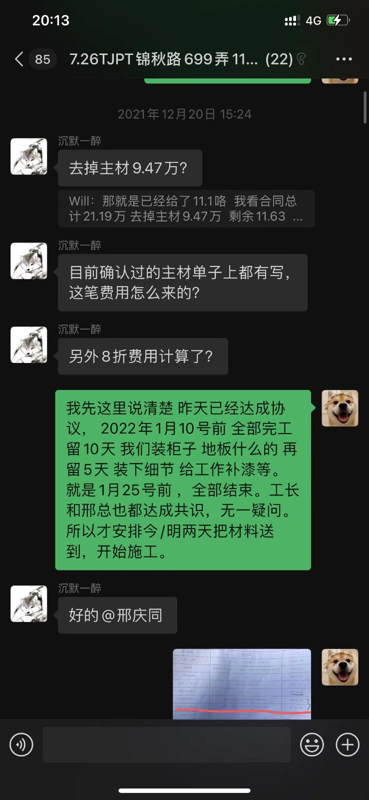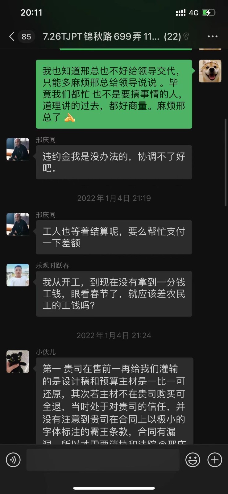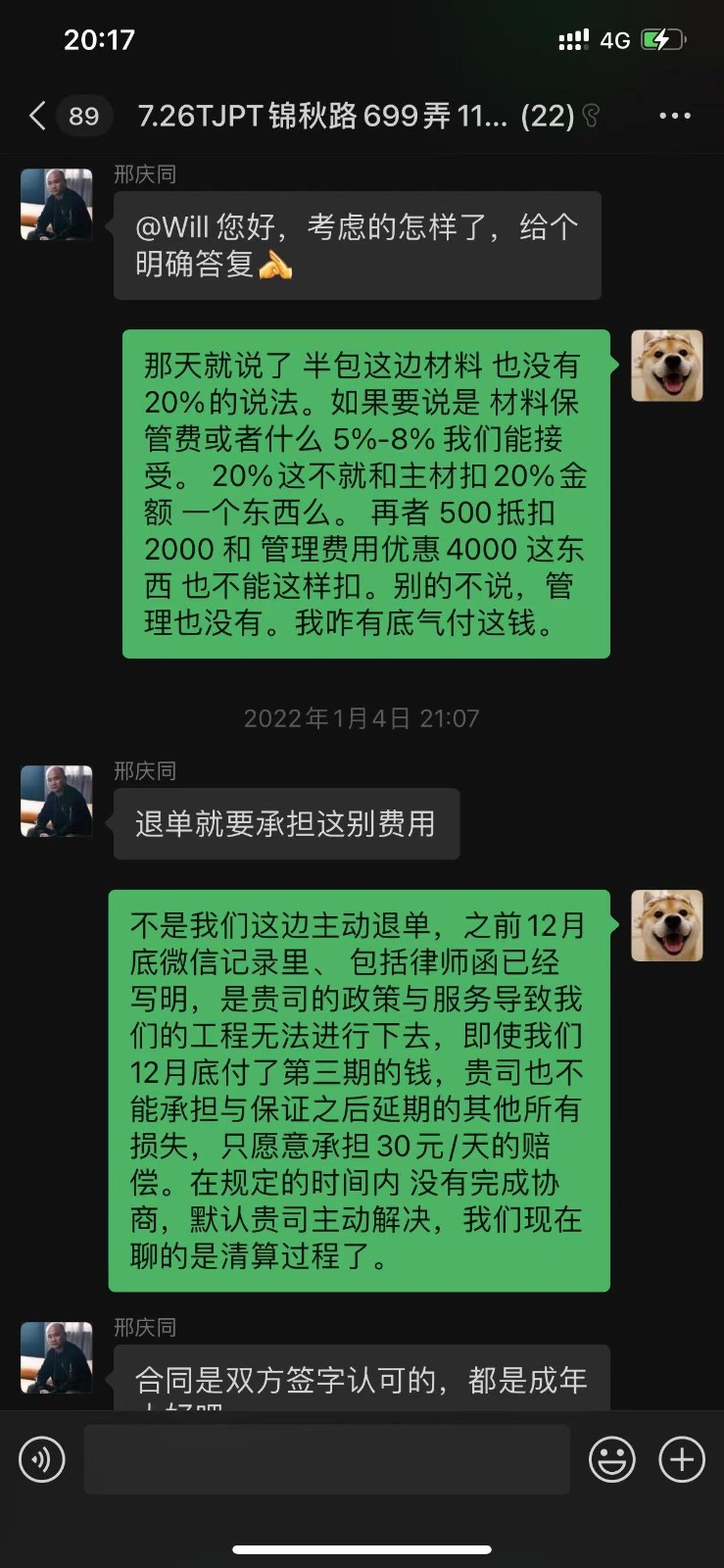 微信群中表示“保證1個月能完成剩余全部內(nèi)容,但是只能做到口頭保證 ”不考慮我方在外租房的費用等額外因為延期造成的嚴重損失,只認定30元/天的延期費。愛賠不賠,要么我方今天付款,后面我只管發(fā)材料,不管施工進程,要么就大家拖著。要么你主動節(jié)約,再多賠30%解約費。