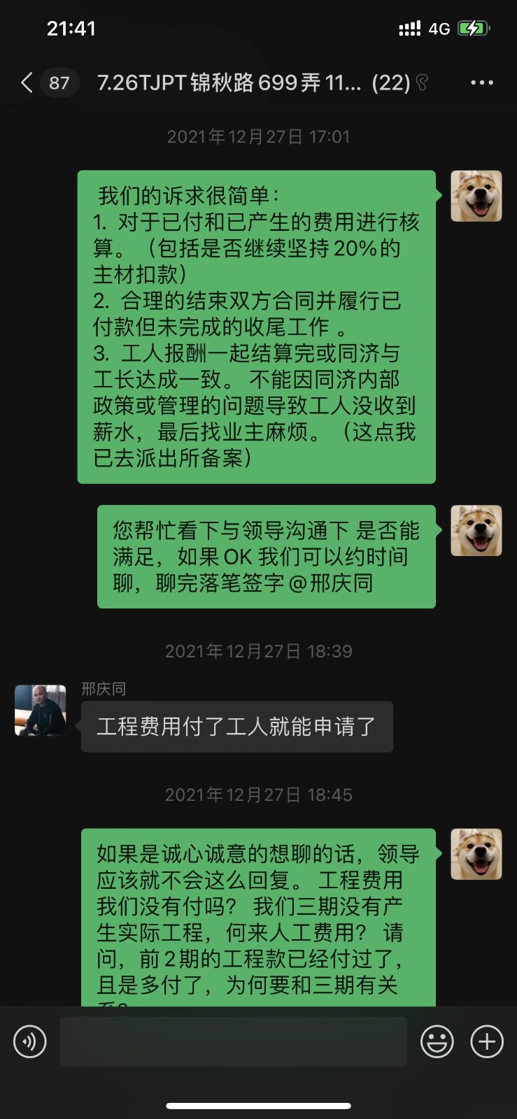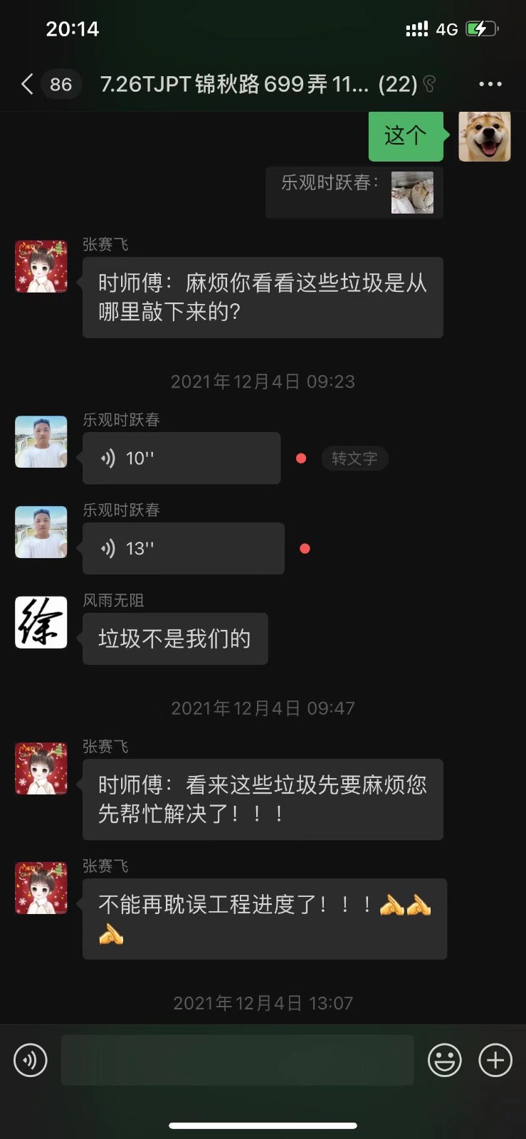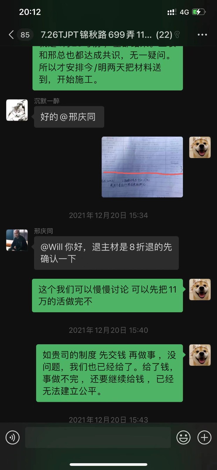 例如2 :做完第一階段項目后,進行第二階段項目。工長施工態(tài)度消極,進程非常緩慢,工長說沒有拿到之前第一階段的工資,不好在墊付款項進行下去,告知裝修公司,裝修公司直言不管你們事。但是裝修公司收了我們的款項,不去管理,不去及時調(diào)整或者監(jiān)督現(xiàn)場,只在微信群里把所有責任都推卸給工長,就當做了管理,讓我們自己和工長對接。試問 我們的合同是與裝修公司簽訂的,為什么付了管理費、人工費給裝修公司,還需要我們?nèi)ス芾??我們給了人工費為何還是沒有工人愿意做? 裝修公司明知是自己壓著款項不給工人,還繼續(xù)要問我方收取后續(xù)款項。甚至直言:你這錢不付,工人拿不到錢,拿不到錢 工人要來你家鬧事的。(有錄音)