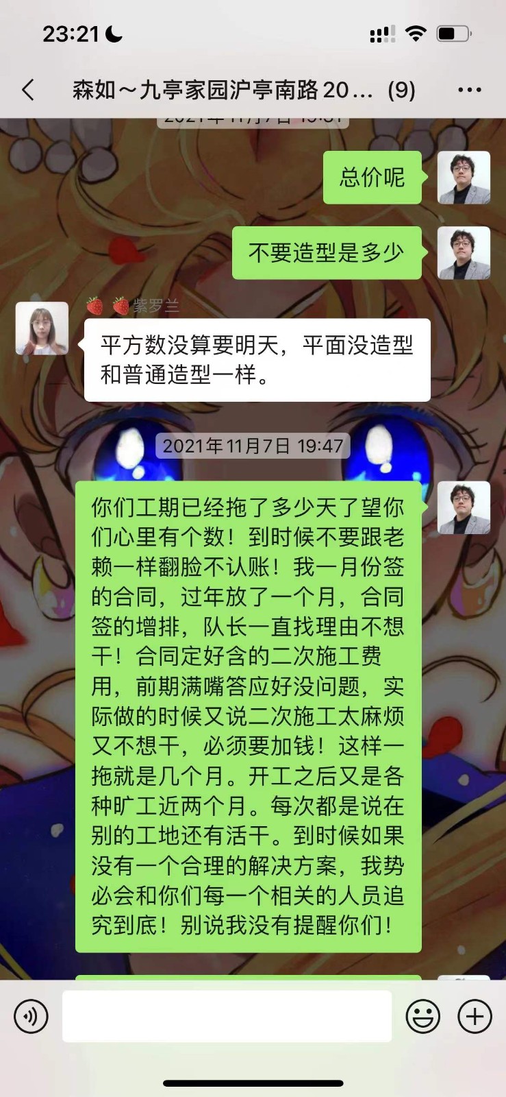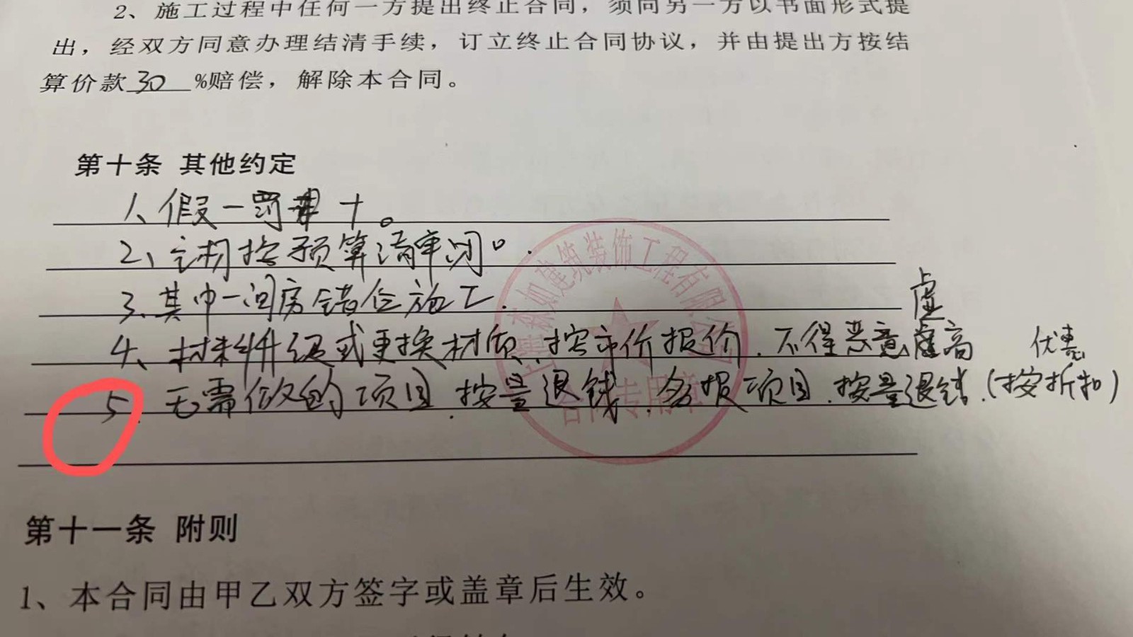 8.前期逼著你給錢,不提前把錢付掉就不干活或者干活拖拉。承諾的不做的、多算的最后會全部結(jié)算并退還給你,結(jié)果驗收完之后就是另外一副嘴臉。拖延工期一概不認,你讓他結(jié)算一下退款款項,兩個禮拜都還沒出來,還要收你30%管理費。