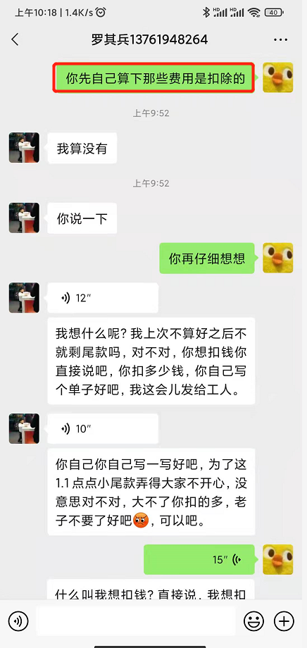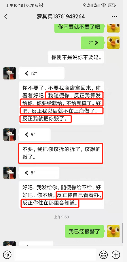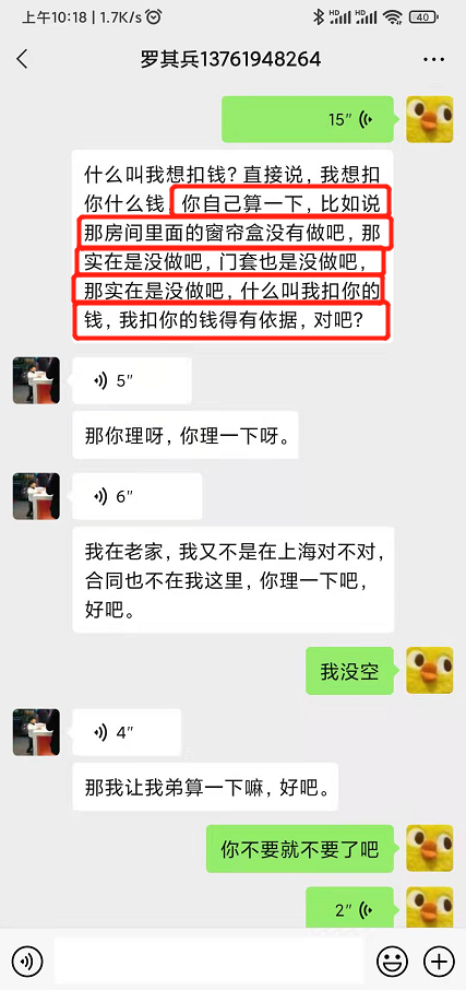 2022年1月15日,筑洛公司的羅其兵與投訴人的設(shè)計人員羅萌(施工過程中投訴人的履約代表)微信聯(lián)系,要求支付尾款。羅萌認為整個工程還有未做項目(如窗簾盒、門套等)需要在結(jié)算時扣除,要求羅其兵寫個未做項目的單子。溝通中,羅其兵態(tài)度惡劣,并對羅萌進行言語威脅:“你看著好吧,我隨便你,反正我算好發(fā)給你,你要給就給,不給就算了。好吧,反正我以后就不在上海做了,反正我就把你毀了”、“我把你該拆的拆了,該敲的敲了”、“我發(fā)給你,隨便你給不給,好吧,你不給,反正你自己看著辦,反正你住在那里會知道”。