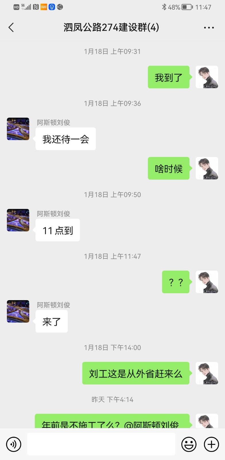 我在24號過去發(fā)現(xiàn)再無進(jìn)展,問年前是否還動工,小劉回復(fù)明天就施工,可是今天沒有任何動靜,人也沒去現(xiàn)場。發(fā)微信不回復(fù)了。