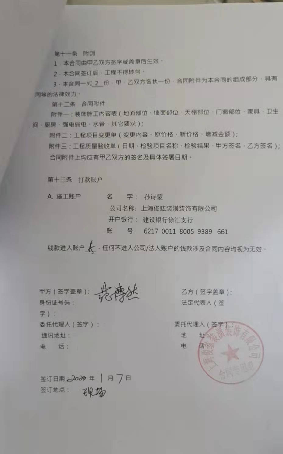 1月4日本已幾乎選定裝修公司,一個自稱嘉裝家博會的電話打來說他們有更便宜更快速的裝修公司推薦,隨后推了兩個人來量房。5號一個自稱來自己欣匠的設(shè)計公司負(fù)責(zé)人老孫過來,說他們的裝修隊過年不回家,最晚過期間前施工完畢。于是1月7號簽訂合同約定9號入場,工期30天。