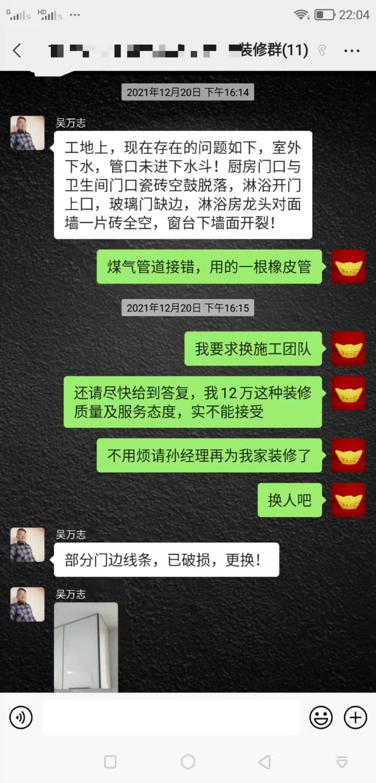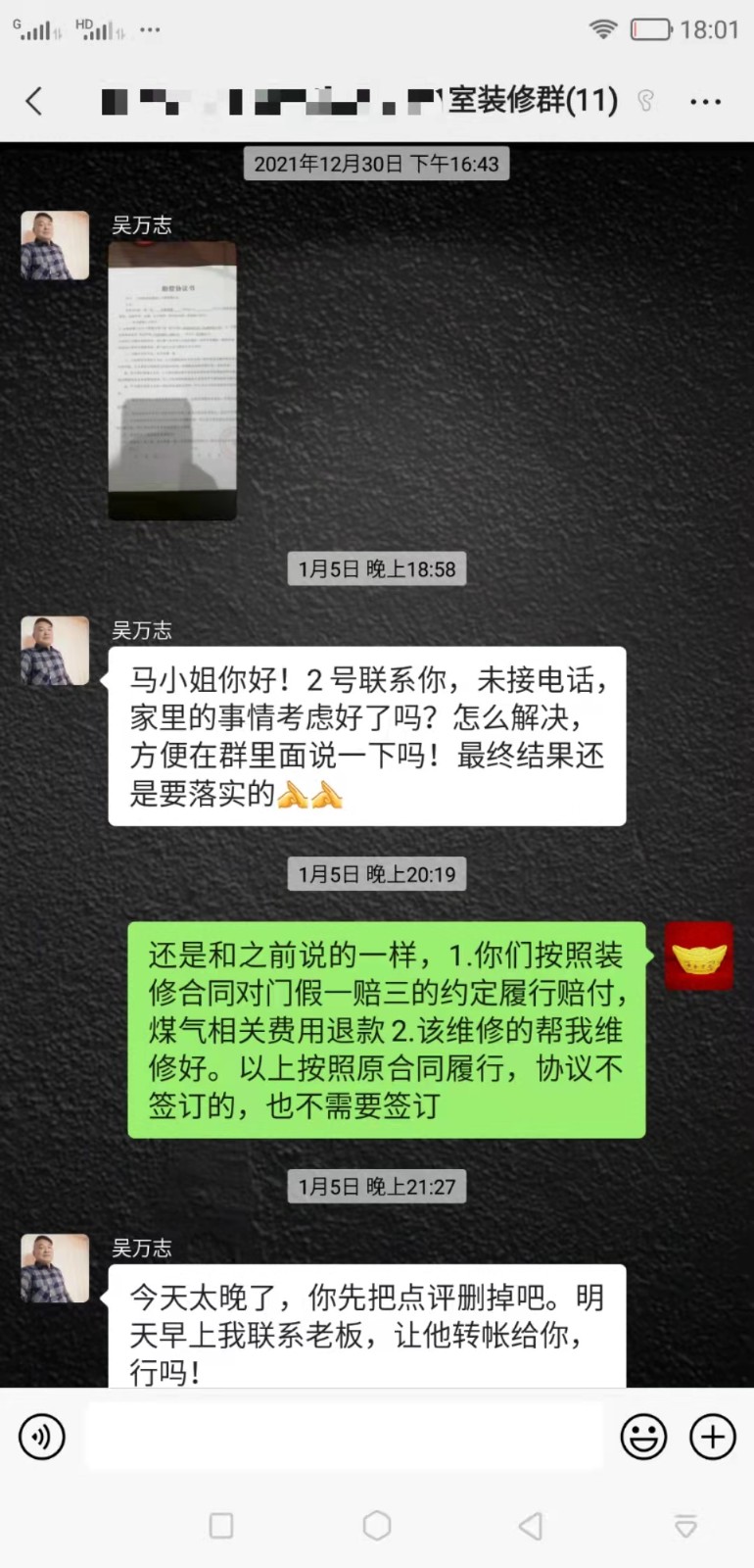 8. 以上問題發(fā)生后,多次聯(lián)系尚高,尚高監(jiān)理吳萬(wàn)志上門檢查了一次在裝修群里反饋存在問題,之后便不再理會(huì),無(wú)奈給予網(wǎng)上差評(píng),一時(shí)間項(xiàng)目經(jīng)理、監(jiān)理、設(shè)計(jì)師不斷聯(lián)系我,要求刪除差評(píng),但并不為我解決問題。期間尚高承諾讓我先刪除差評(píng),再履行假門賠付,出于對(duì)尚高的不信任,我并沒有答應(yīng)。之后多次對(duì)我進(jìn)行騷擾,項(xiàng)目經(jīng)理更是在春節(jié)前要安排做門套的工人上門,對(duì)于假烤漆門,我的訴求是假一賠三,讓裝門套的工人上門用意何在?把假烤漆門換了,就可以不用賠付了!