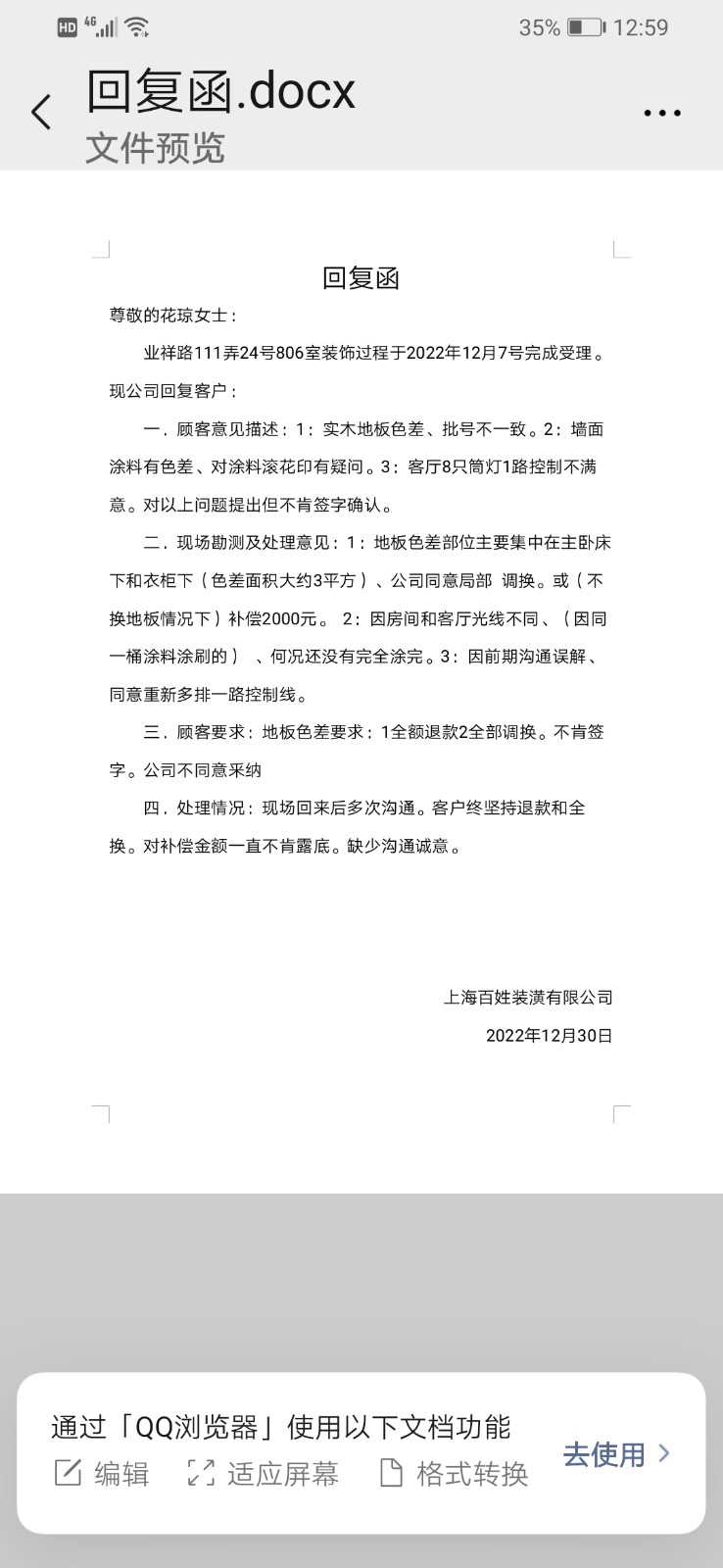| 投訴類型 | 施工質量 | 投訴人 | 花** | 被投訴單位 | 上海百姓裝潢有限公司 |