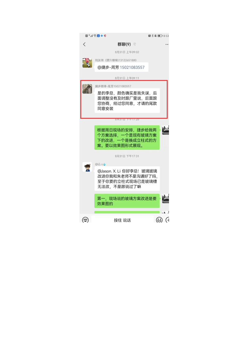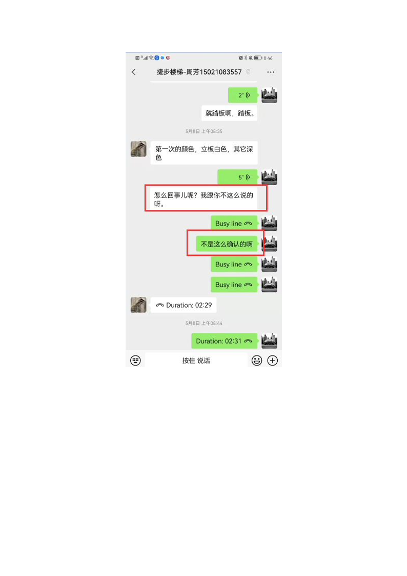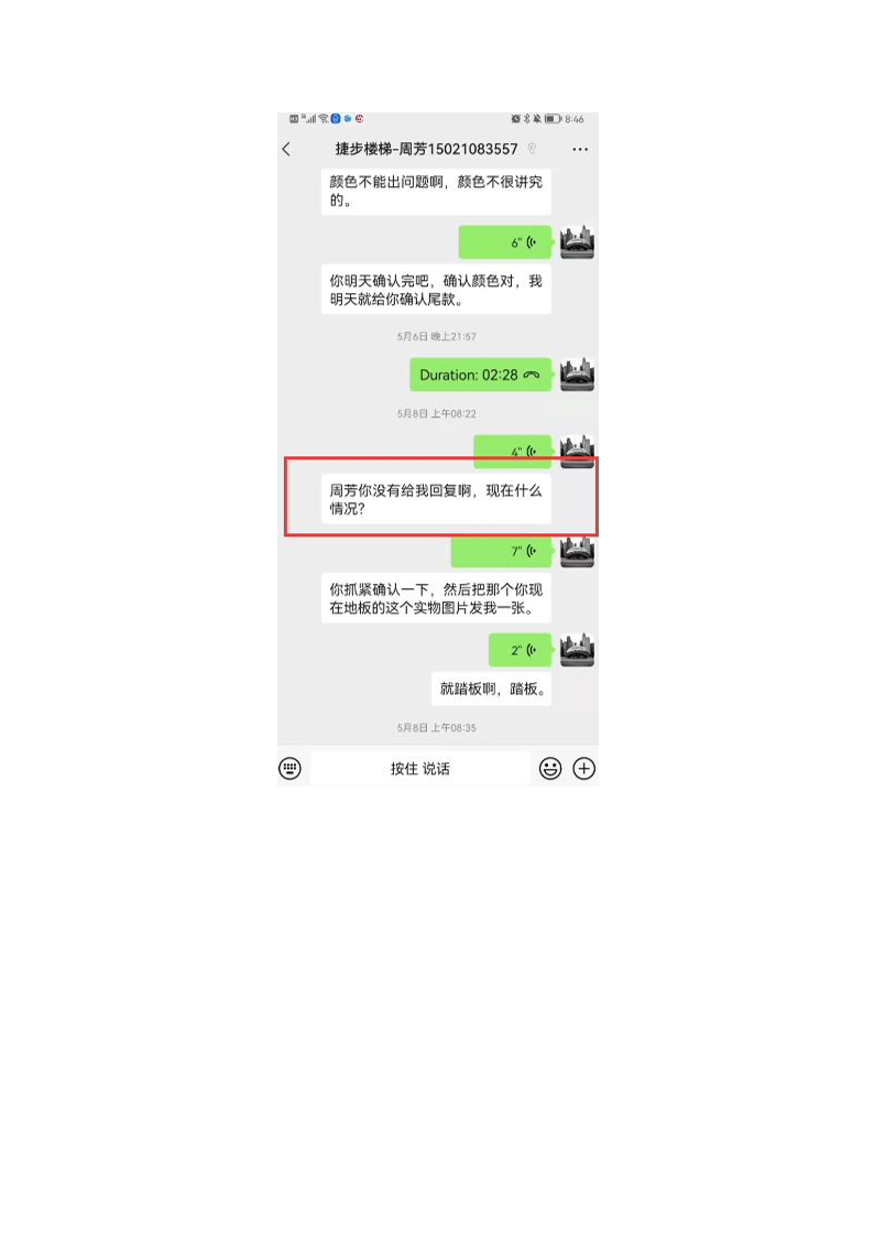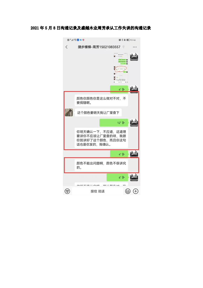 2021年5月8日,投訴人通知盛越木業(yè)銷售人員周芳可上門安裝樓梯地板部分,周芳突然告知投訴人立板顏色做錯,應為木色但工廠出貨顏色為白色。經(jīng)反復溝通,周芳再三表示已經(jīng)做好無法更改,并不斷表達歉意,投訴人考慮重做對工期的影響及,為了實現(xiàn)盡快入住,勉強同意接受安裝,并告知后續(xù)不能發(fā)生任何問題。(證據(jù)五:2021年5月8日溝通記錄及周芳承認工作失誤的溝通記錄)