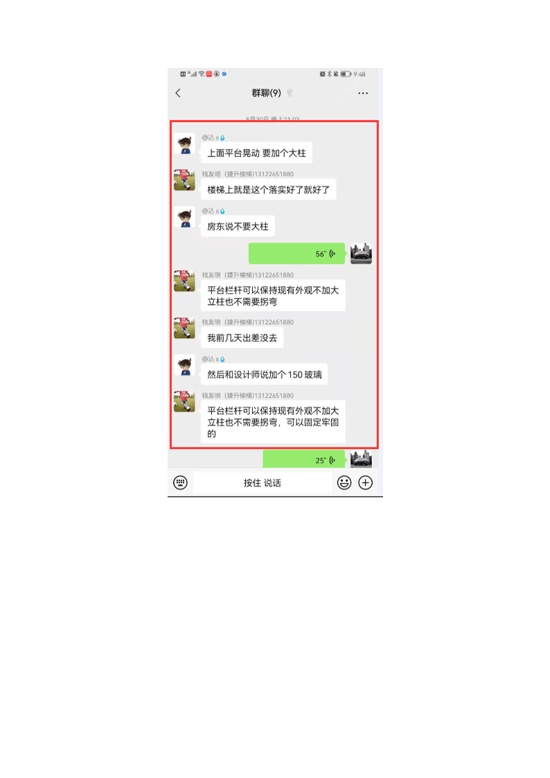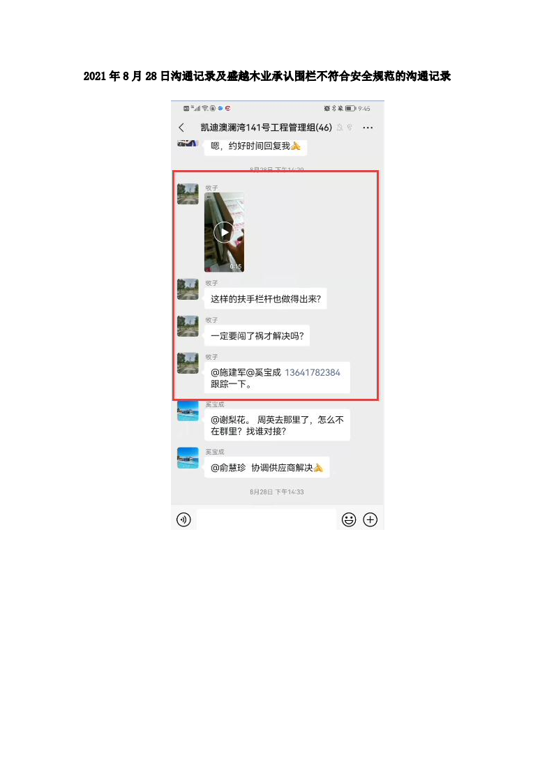 2021年8月28日,投訴人又發(fā)現(xiàn)位于三樓的圍欄存在嚴重安全問題,僅用兩根手指即可晃動,完全無法起到安全防護作用。經(jīng)投訴人父親提出后,盛越木業(yè)承認該設計不符合安全規(guī)范。(證據(jù)九:2021年8月28日溝通記錄、視頻及盛越木業(yè)承認圍欄不符合安全規(guī)范的溝通記錄)