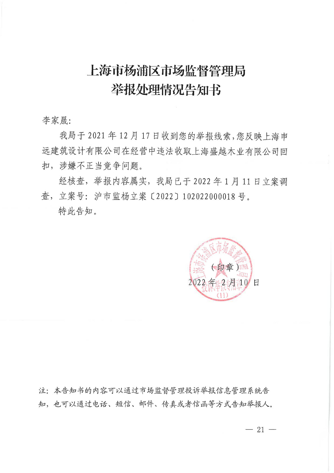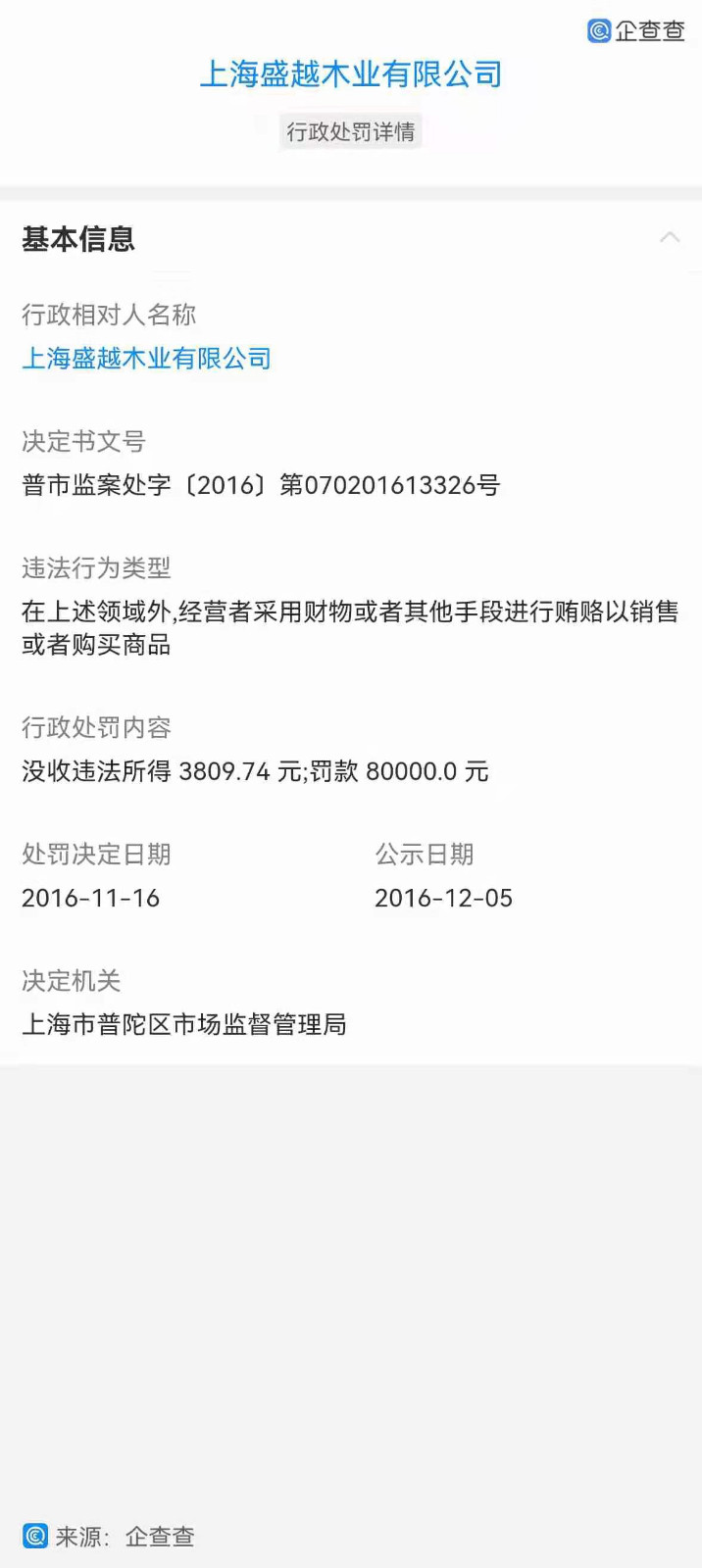 此后,投訴人對盛越木業(yè)被進行了企業(yè)調查,發(fā)現(xiàn)盛越木業(yè)于2014年在另一起與申遠公司的合作項目中,因向客戶提供劣質產(chǎn)品,欺騙消費者,被上海市浦東新區(qū)法院判處賠償消費者216,426元。此外,2016年11月16日,盛越木業(yè)因通過向申遠公司行賄的方式獲得訂單,因商業(yè)賄賂違法行為被上海市普陀區(qū)市場監(jiān)督管理局處以行政罰款80,000元。由此可見,申遠公司長期收受該盛越木業(yè)商業(yè)賄賂,幫助其獲得業(yè)主的訂單,為其隱瞞提供偽劣商品的違法歷史,并在發(fā)生爭議后包庇其違法行為。(證據(jù)十一:浦東新區(qū)法院判決書及普陀區(qū)市場監(jiān)管局處罰決定書)