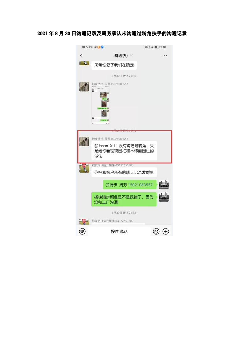 根據(jù)盛越木業(yè)的解釋,該拐角處的特殊設計是由于房屋拐角旋轉踏步扇面高度較高導致。但是,盛越木業(yè)自始至終從未告知投訴人現(xiàn)場條件將導致這一不尋常的扶手設計,也未向投訴人提供有關該問題的解決方案供投訴人比較選擇。事實上,該問題完全可以通過立柱型樓梯完美解決。相反的,盛越木業(yè)自行選擇采用該不尋常的設計并向投訴人交付。(證據(jù)七:2021年8月30日溝通記錄及周芳承認未溝通過轉角扶手的溝通記錄)