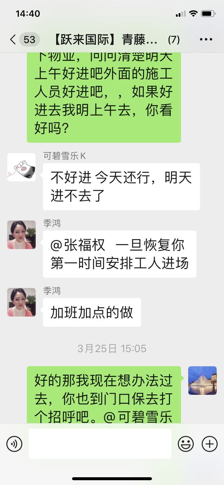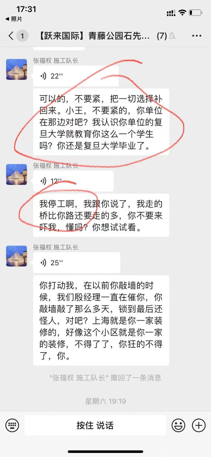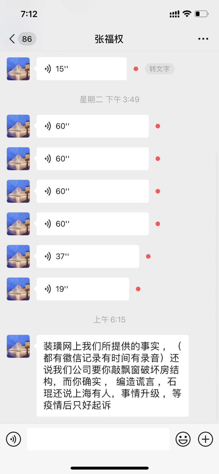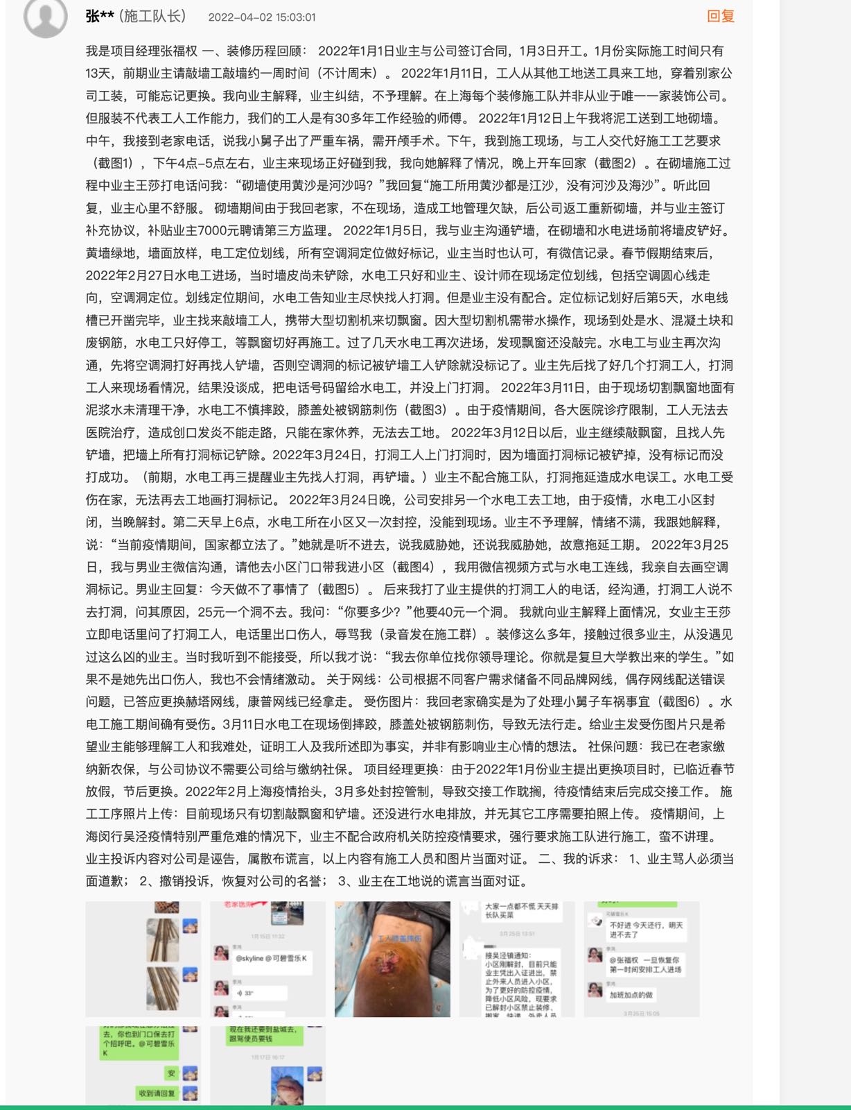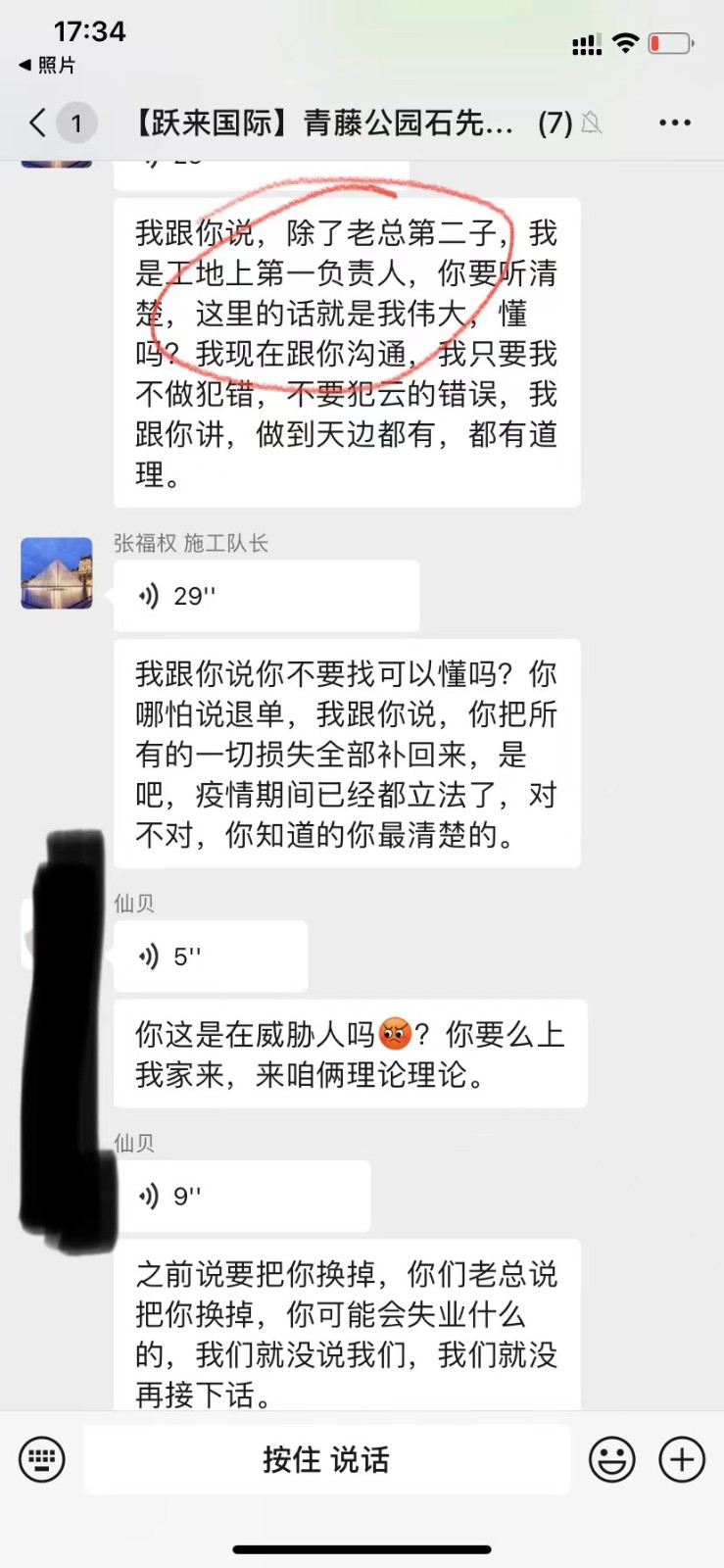 第二,躍來官網(wǎng)中說宣傳“所有工程管理人員均為正式在職員工”,我家工地項目經理姓名為張福權(后續(xù)溝通中句句威脅,威脅刪除差評、停工且威脅到業(yè)主人身安全)(附件4 5),要求調查核實且要求公司提供此人2021年至2022年社保繳納記錄以示說明。