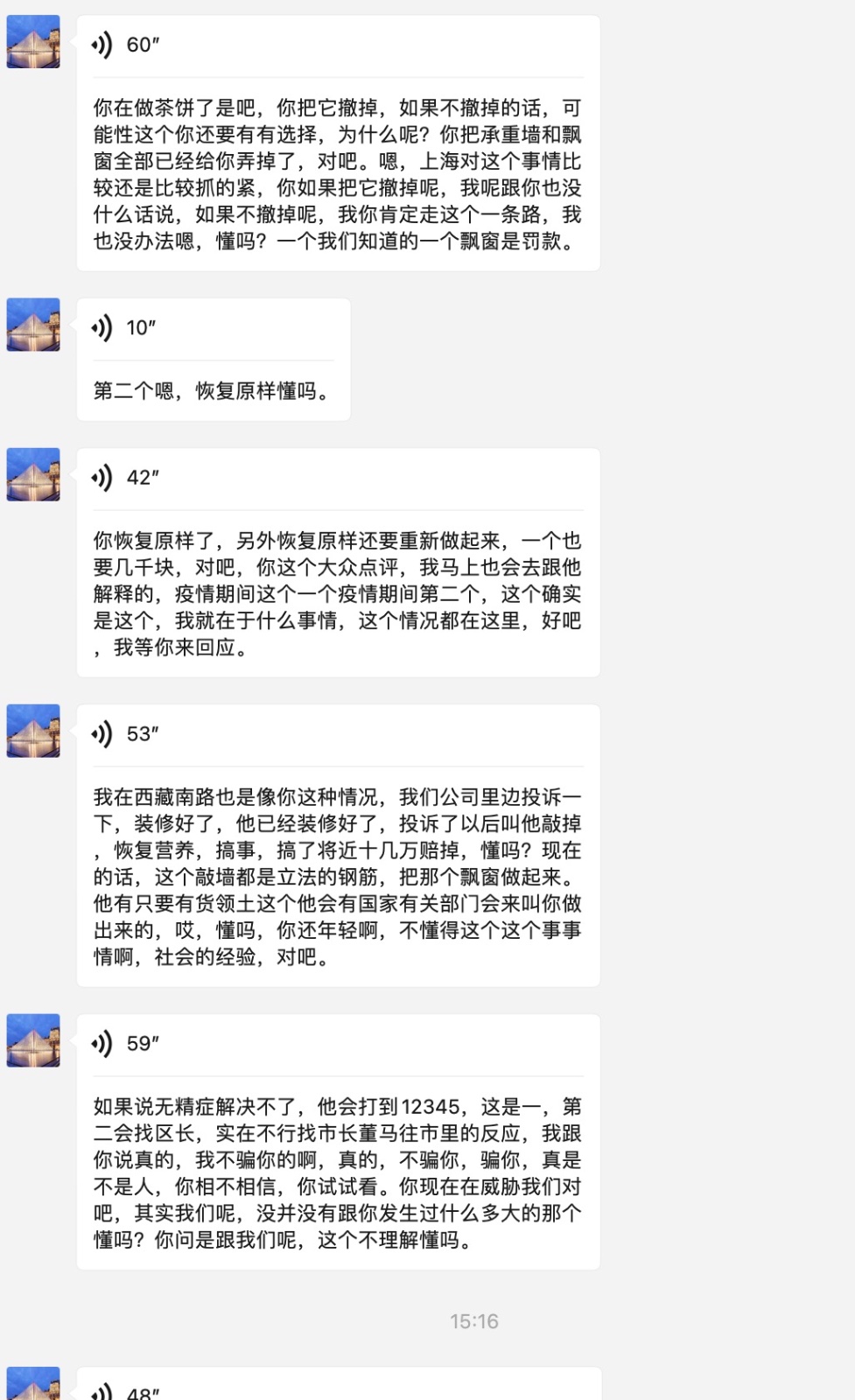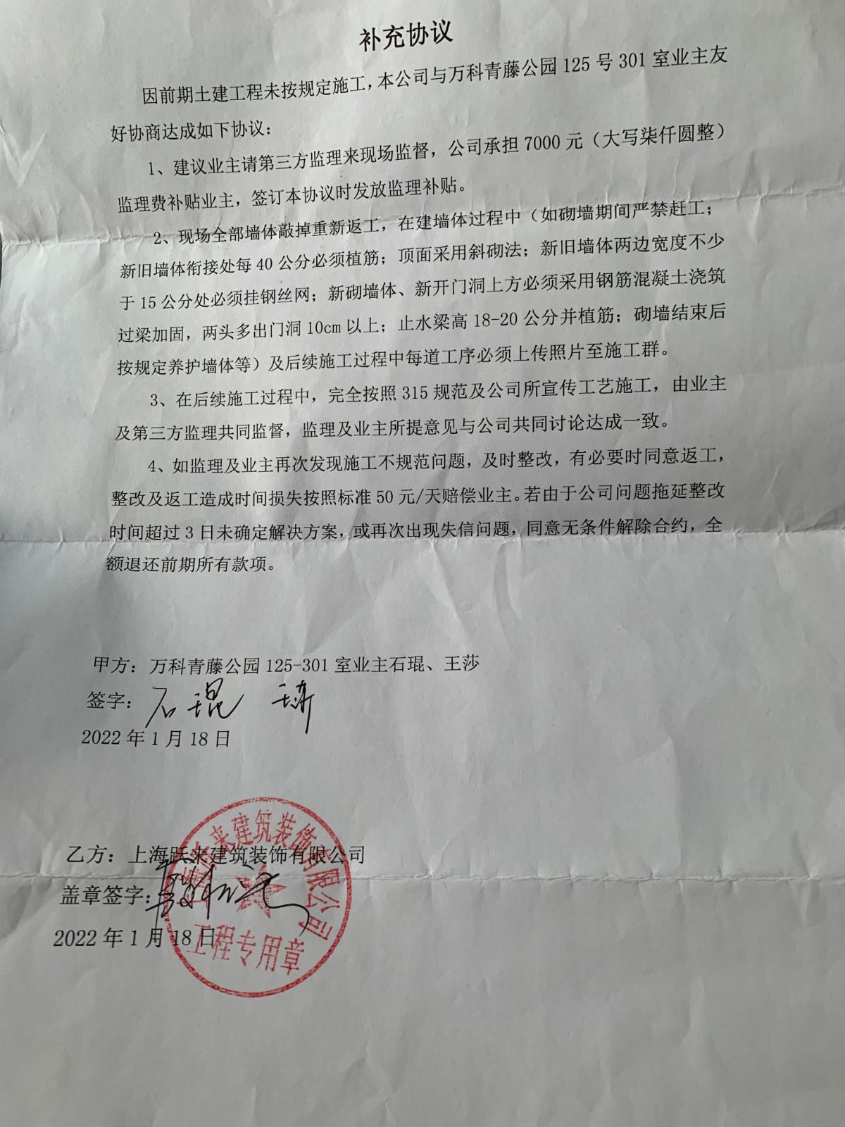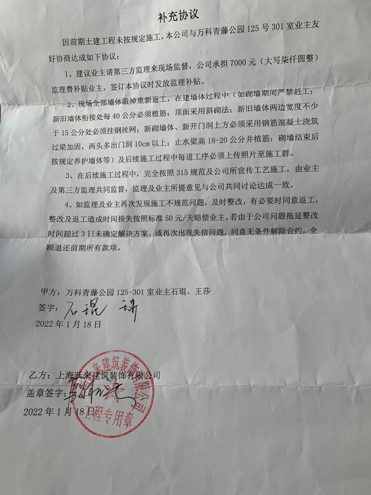砌墻工藝出現(xiàn)問題時公司為掩蓋真相,避免我舉報其虛假宣傳,簽訂補充協(xié)議(見附件6),其中明確說明“若今后出現(xiàn)失信問題無條件解除合約全額退還前期所有款項”,但目前與裝修公司溝通,其一直冷處理,項目經理不斷威脅停工狀態(tài),以各種理由不履行合同約定(附件7)。最重要的失信問題有三點(小問題字數(shù)限制無法全部列舉)。