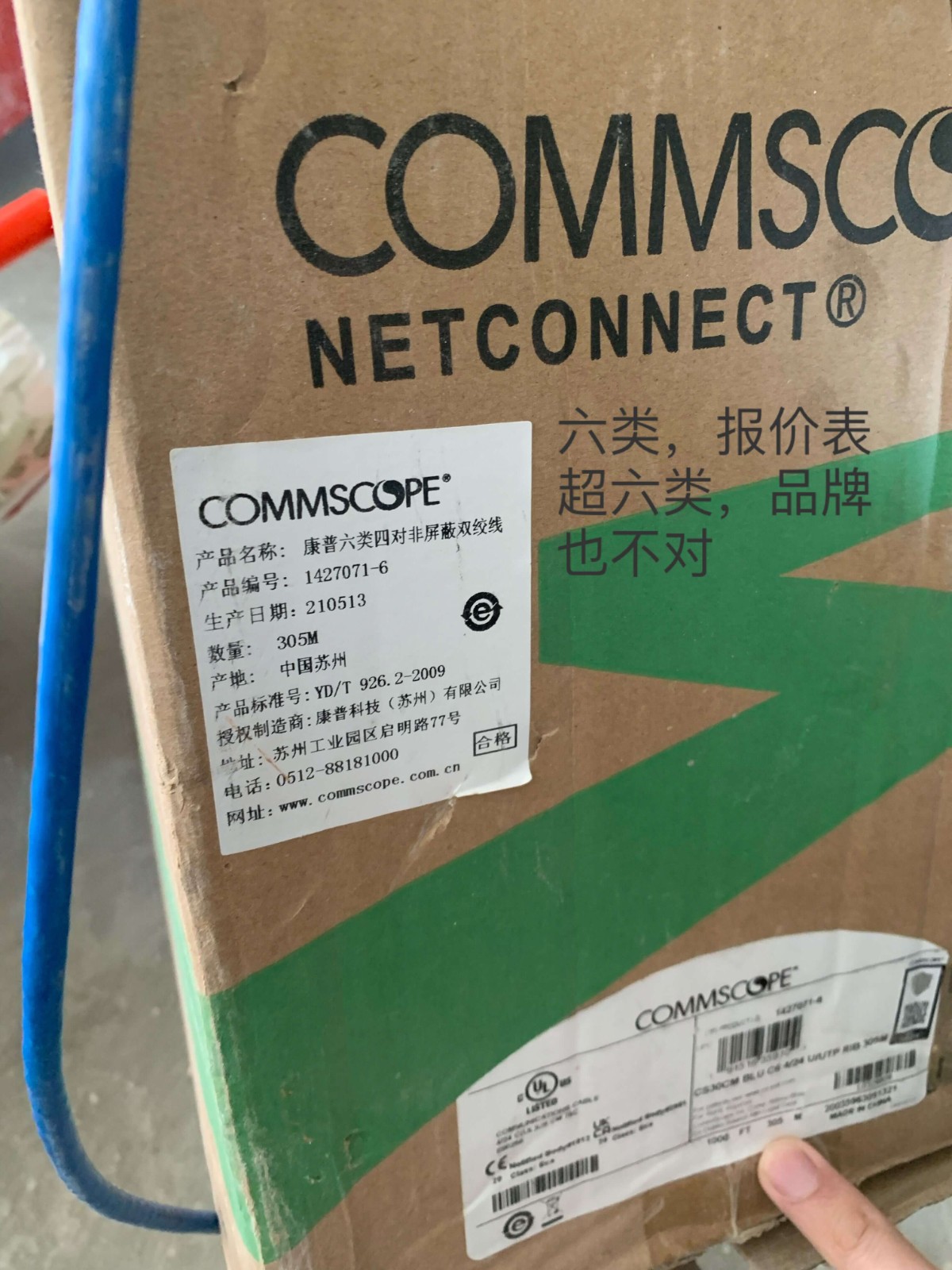 第二,失信事件遠不止于此,水電交底后驗收材料時,簽訂的合同報價單中網(wǎng)線為“德國赫塔超六類”,但實際送到的材料為“康普六類網(wǎng)線”,且一開始公司拒絕承認網(wǎng)線送錯,在我拍照核實下才承認材料有問題。(附件8 9)