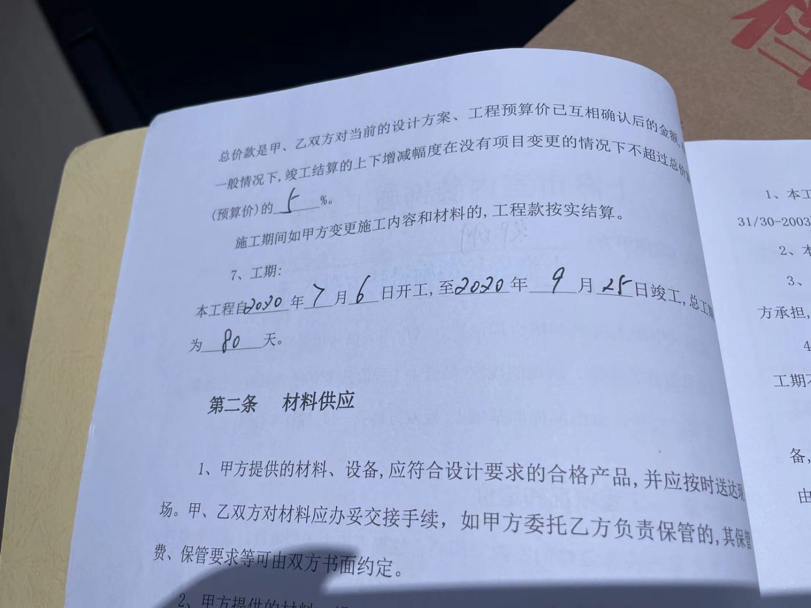 1、合同上工期是2020年9月25日竣工,實際是2021年1月18日驗收,拖了4個月,沒有一點說法,要求按照合同里的約定,一天100元賠償。