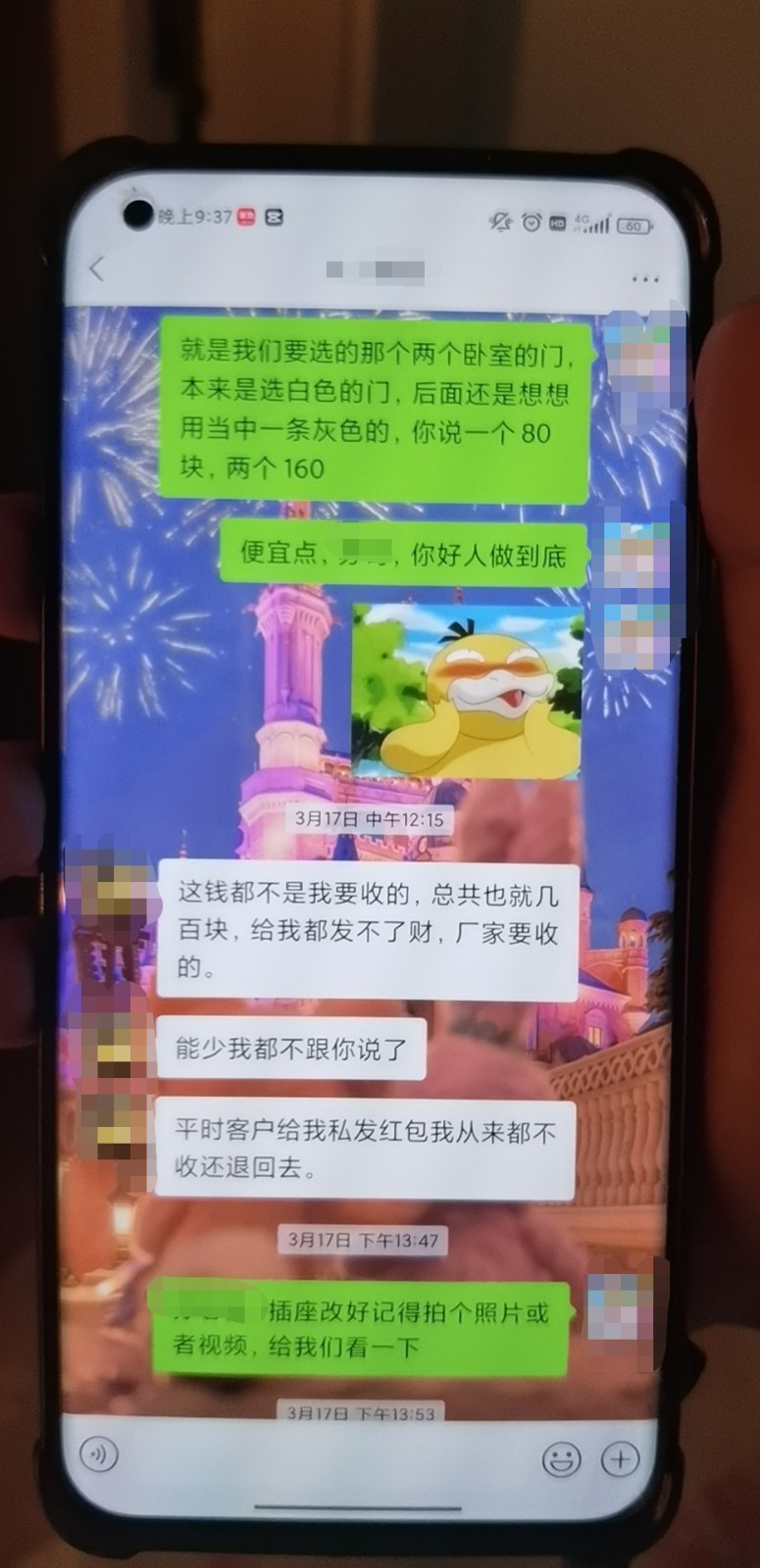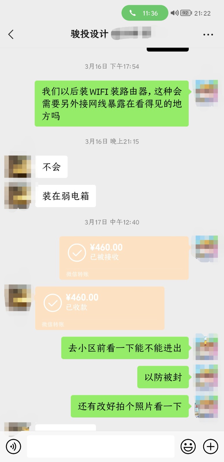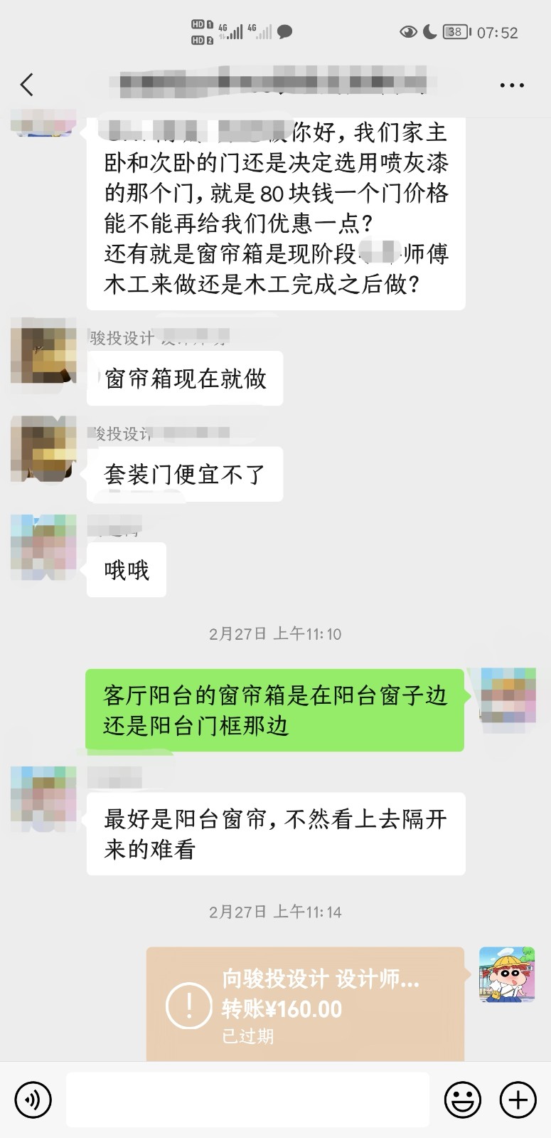 回家思前想后覺得還是象牙白帶橫條灰的門好看,于是與設(shè)計(jì)師提出修改,并把160元轉(zhuǎn)賬到微信群;過幾天我們又考慮到電視墻插座的位置對(duì)于投影儀來說太高,向設(shè)計(jì)師提出把插座往下改一段距離,設(shè)計(jì)師告訴我們改插座300元,我們答應(yīng)了,同時(shí)提到了門改成白色中間段帶橫條灰的款式,300元的改插座費(fèi)和改門款式的費(fèi)用一共460元當(dāng)場(chǎng)私信轉(zhuǎn)賬設(shè)計(jì)師并接收了。