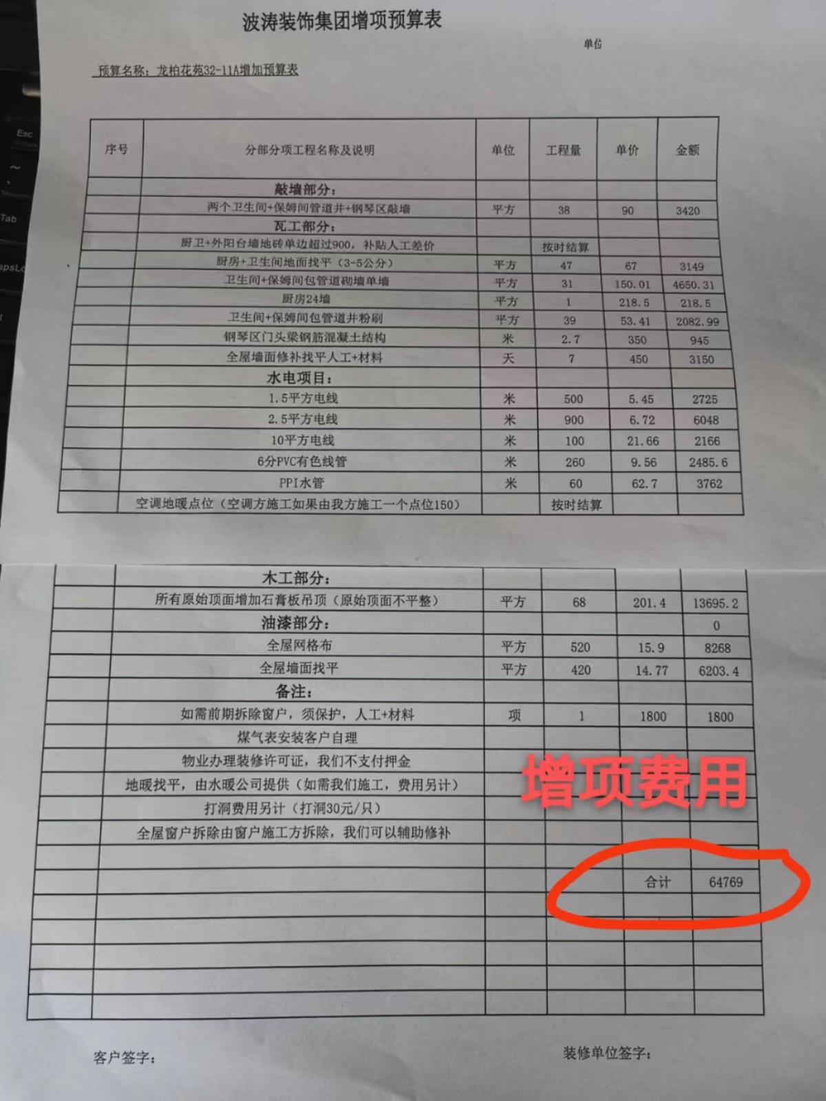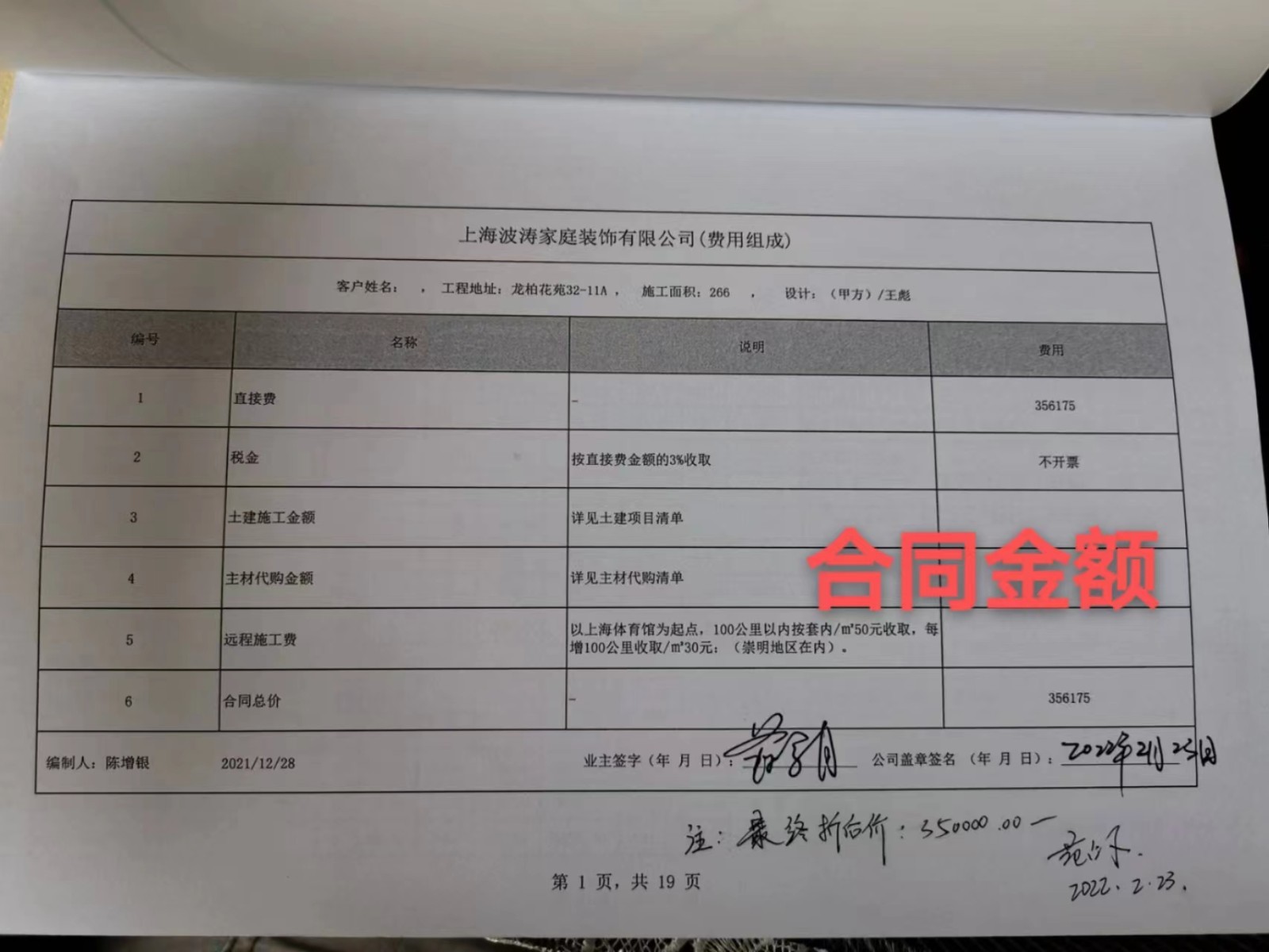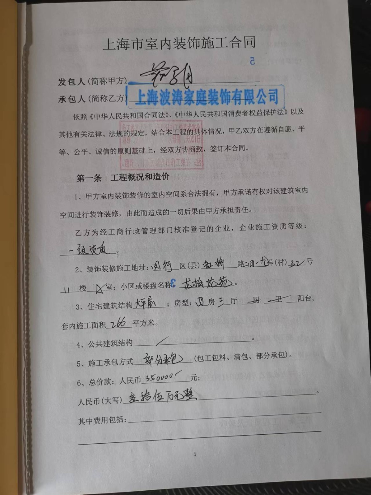 蔣鳴月女士與上海波濤家庭裝飾有限公司,于2022年2月23日簽訂上海市長(zhǎng)寧區(qū)虹橋路2419號(hào)龍柏花苑室內(nèi)裝飾施工合同,合同編號(hào)SZ0071674(以下簡(jiǎn)稱合同),總工程造價(jià)350000元整。蔣女士于2022年2月24日支付首期款95000元。上海波濤家庭裝飾有限公司于3月11日又提出需增加64769元增項(xiàng)費(fèi)用,占總裝飾費(fèi)用的18.5%。