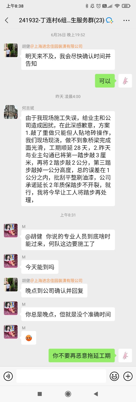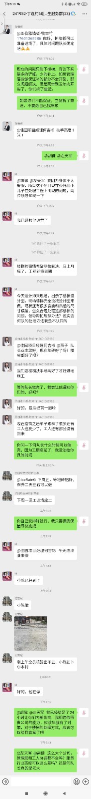 家里最大的問(wèn)題在于樓梯的施工,計(jì)算樓梯踏步高度出現(xiàn)了巨大失誤,最底下的一踏步26cm,最后協(xié)商通過(guò)磨掉的方式去進(jìn)行整改,并且公司金總保證了打磨修補(bǔ)后不會(huì)開裂。但是在和他們的管家溝通過(guò)程中,屢屢想把開裂的原因推著到業(yè)主身上。施工對(duì)長(zhǎng)——何吉斌,管家——胡健,兩個(gè)人都是惡意拖延工期。