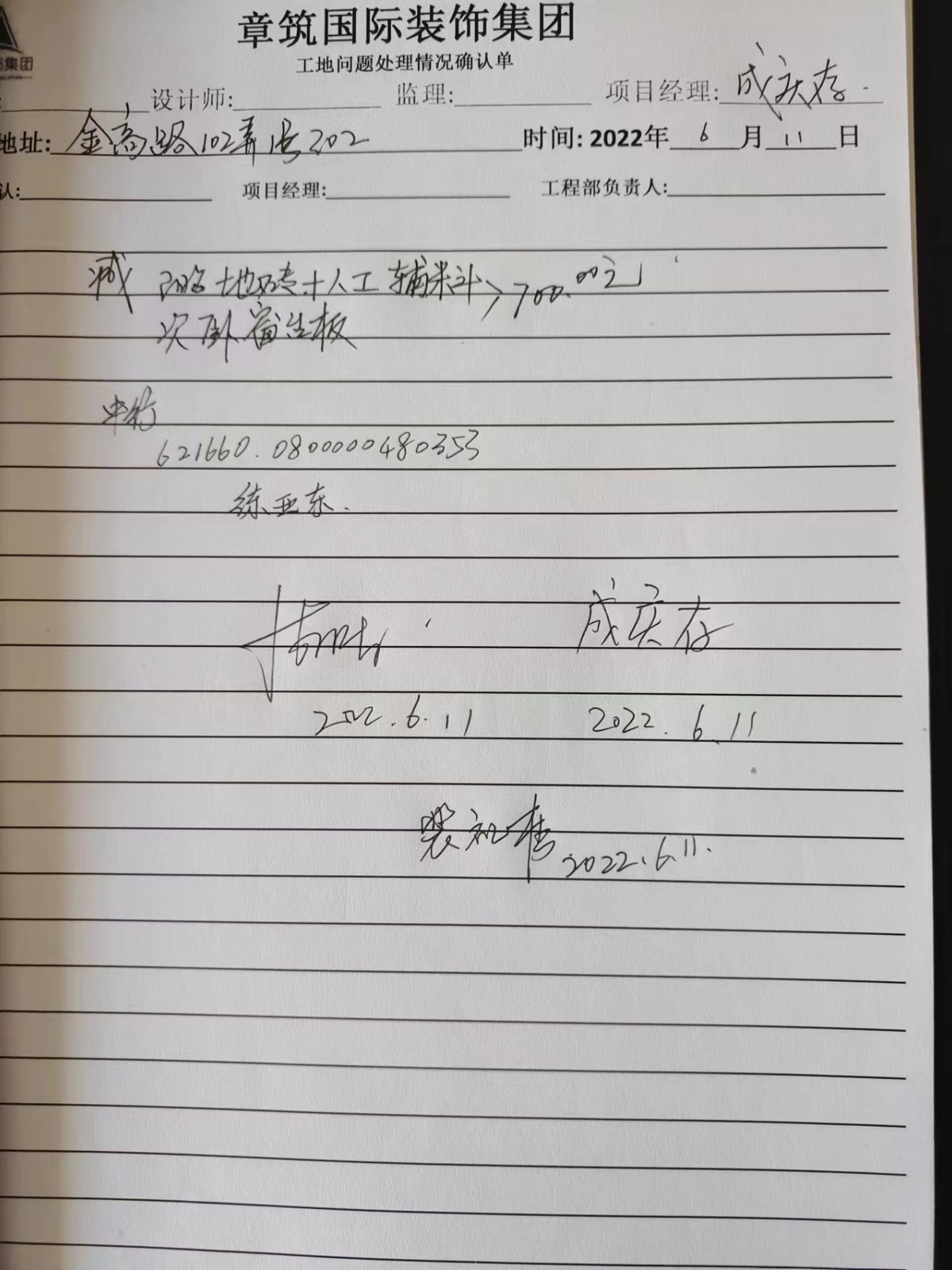 6月11日,裝修完工后,經(jīng)雙方協(xié)商同意,我?guī)退麄冊谕涟屯蒙贤ㄟ^完工后,上海文爵建筑裝飾工程公司需要提交保修卡,水電圖,和退款給我,但一直至今找各種理由,不予執(zhí)行。希行業(yè)協(xié)會能給與幫助監(jiān)督,催促此事,和懲罰此企業(yè)。以免這種壞風邪氣蔓延,以正行業(yè)規(guī)范。謝謝!