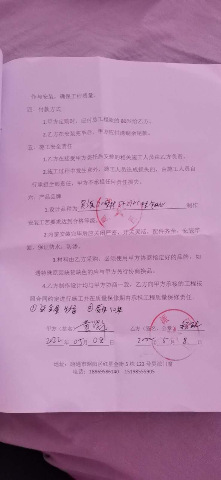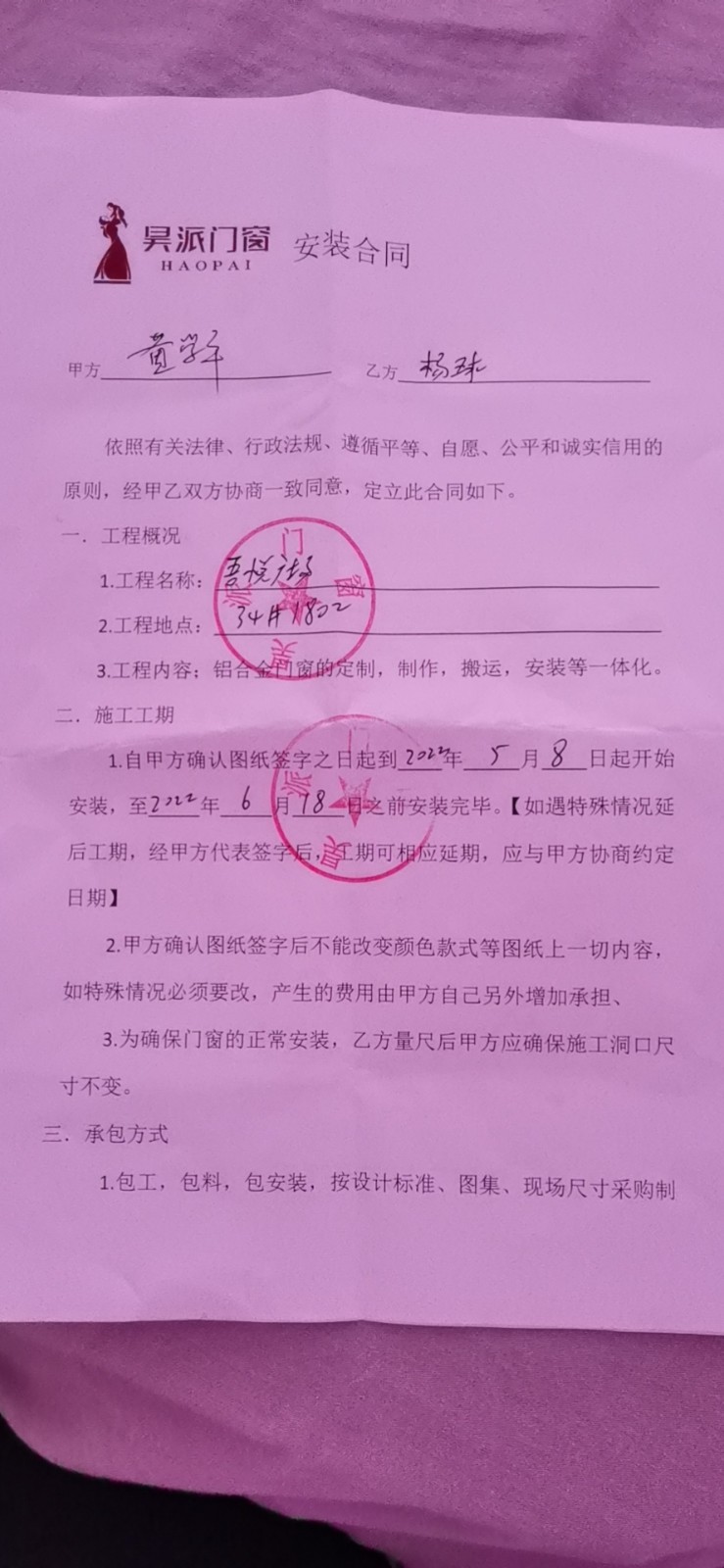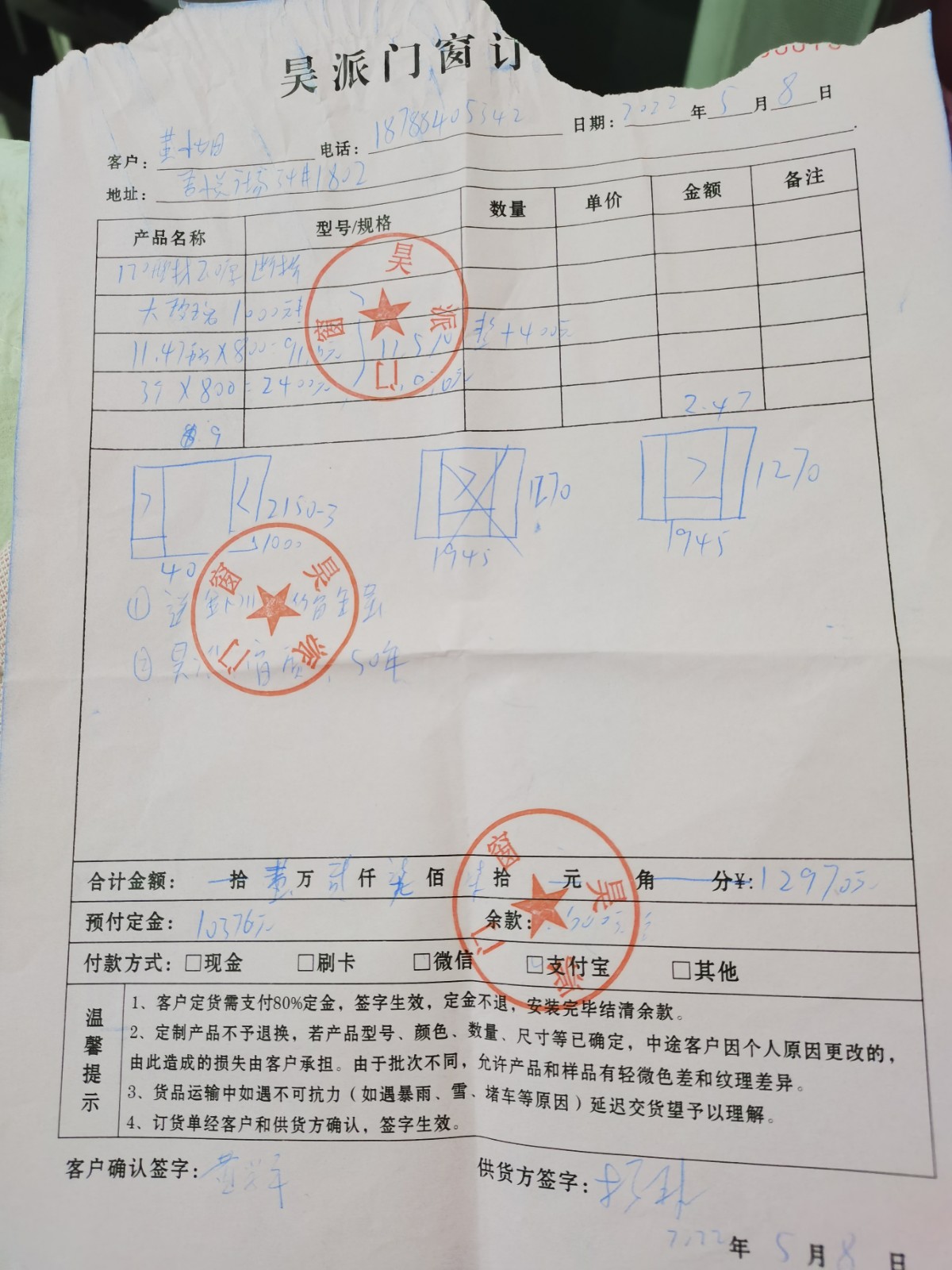 2022年五月八號,我們家封窗選擇的是昊派門窗,他們家在我家還沒有裝修的時候就來量尺寸,當(dāng)時我們簽了合同并留有電話號碼,交了百分之八十的預(yù)付金,并打電話給了房屋設(shè)計師,也將設(shè)計師電話號碼給了封窗老板,跟他們兩邊都說就一定要溝通,最后兩邊都沒有溝通,封窗老板因為沒有對我給他的電話號碼及微信做保存,也沒有打電話跟我確認(rèn),再次復(fù)尺,直接按原來最初量的尺寸跟玻璃廠公司訂好了門窗,我打電話跟她說我家瓦工已經(jīng)弄好了,可以來封窗,他說窗戶已經(jīng)訂好了,沒有來復(fù)尺,我也沒有看到窗戶設(shè)計圖。沒有經(jīng)過業(yè)主的再次確認(rèn)就訂尺寸了。
