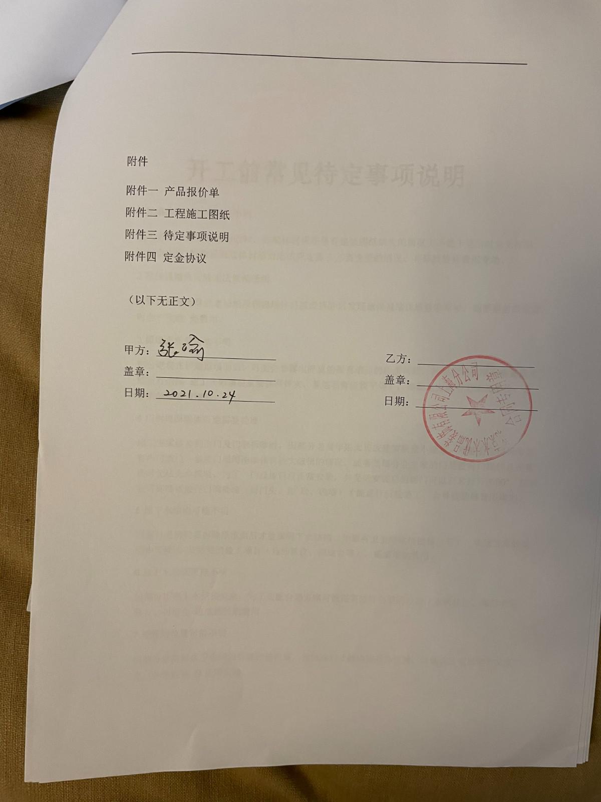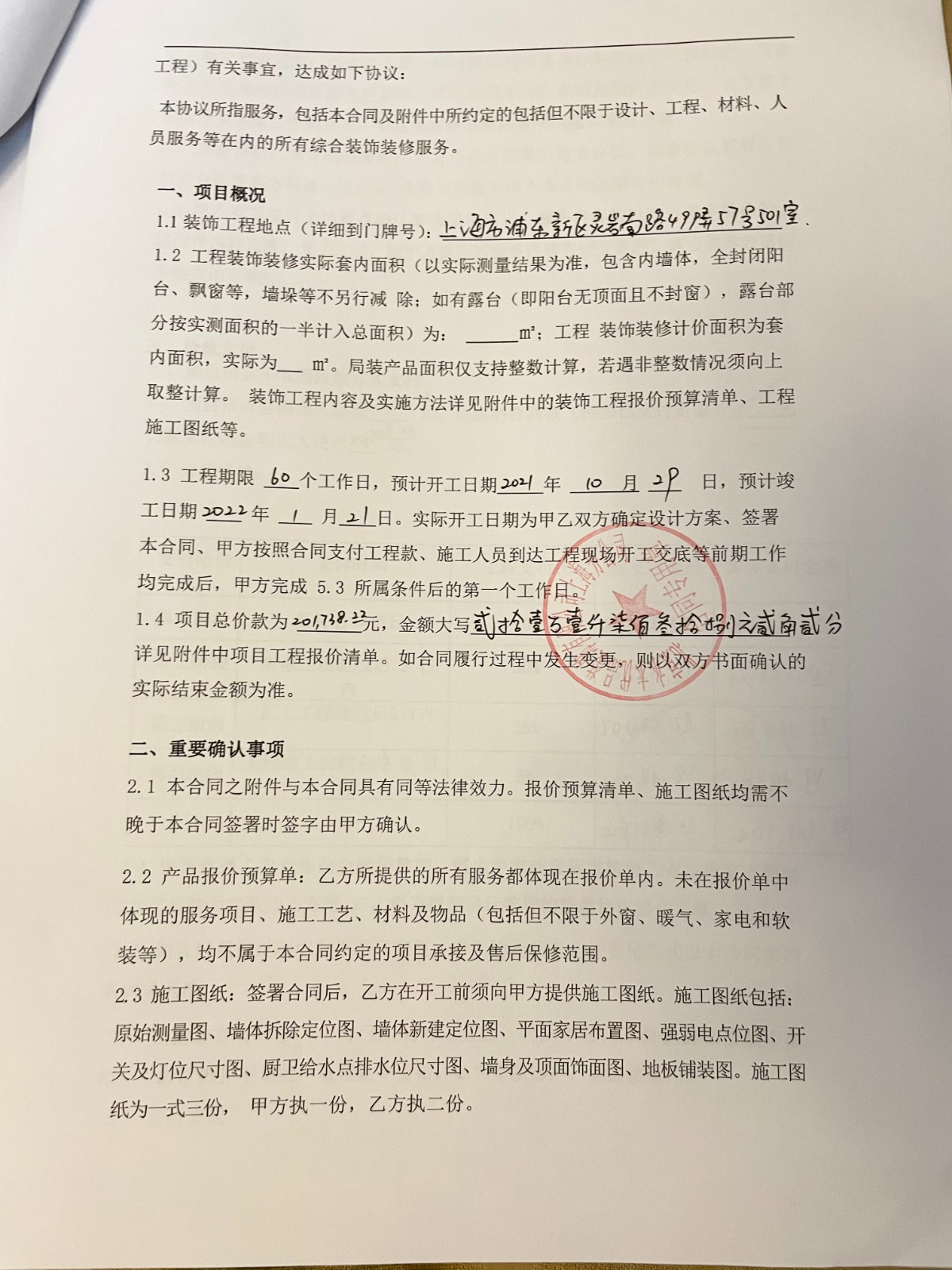 本人張瑜,于2021年10月24日與北京水木優(yōu)品裝飾有限公司上海分公司(品牌名:住范兒,地址:上海市寶山區(qū)滬太路1866號6樓B區(qū)606室)簽訂了室內(nèi)裝修設(shè)計施工合同,對我家進行半包裝修,合同金額逾20萬,已全部支付(由于此前有減項)。工程于2021年10月29日開工,期間經(jīng)歷數(shù)次項目管理責(zé)任不清(無人牽頭負責(zé)跟進、協(xié)調(diào)各方需求等)、施工質(zhì)量不符合承諾(與住范兒承諾的展廳施工方法及用料不符),累累問題均由業(yè)主發(fā)現(xiàn)反映后并未得到住范兒的積極回應(yīng)和解決。