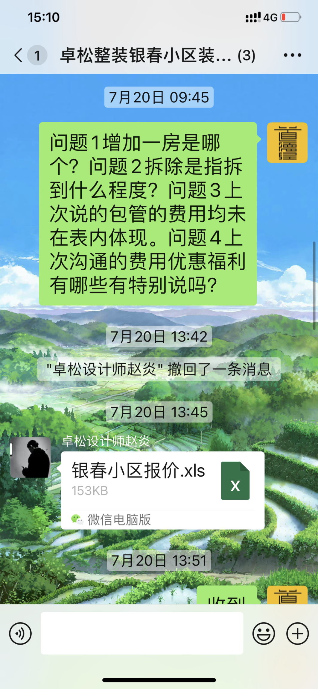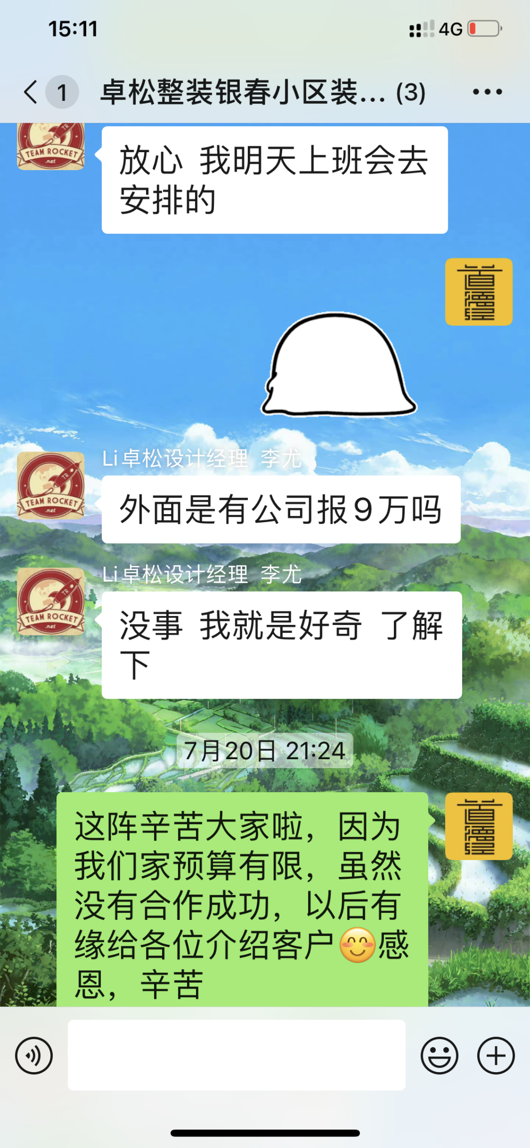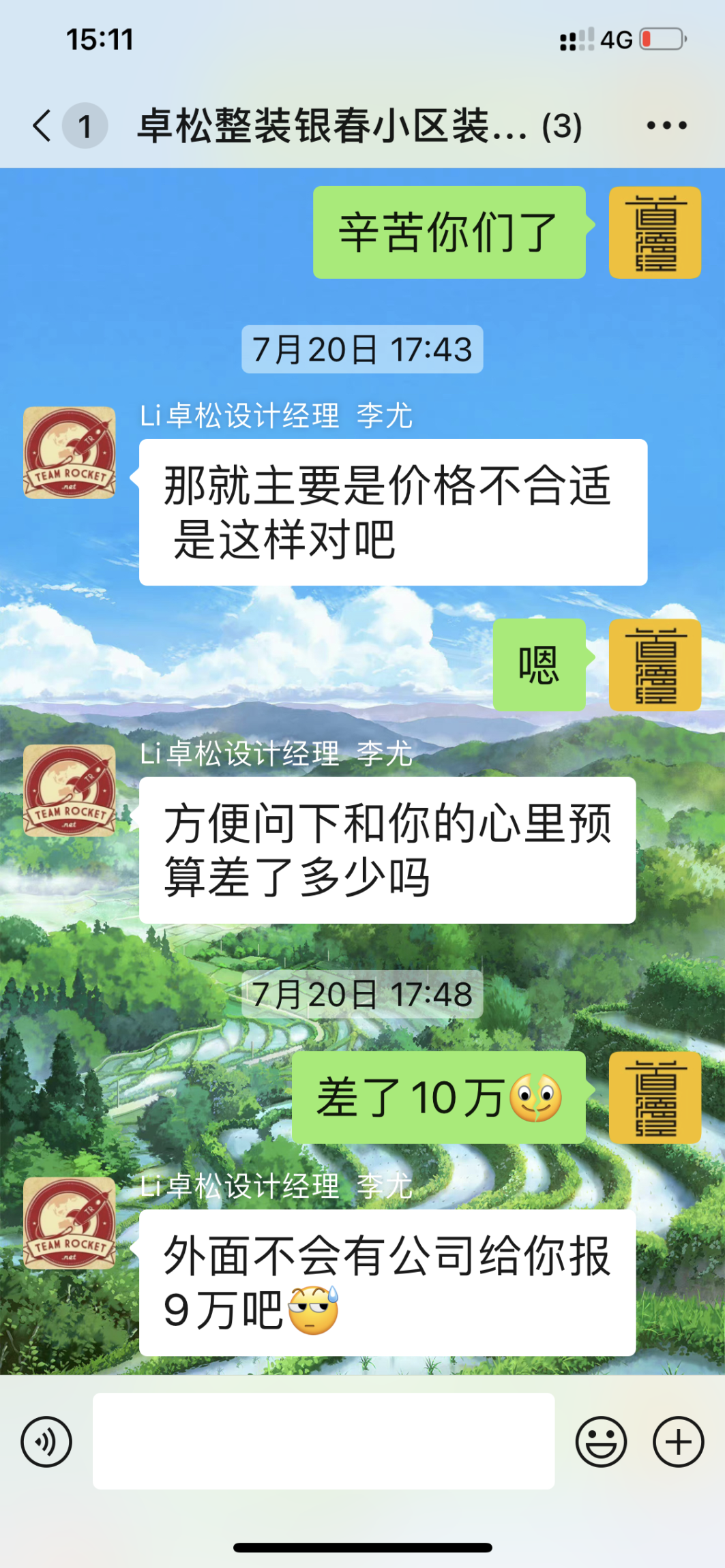 并且我不會跟你和這個設(shè)計師合作,簡單舉個例子:1.你們的服務(wù)沒有和當時我第一次來你們公司你們大李總在的時候給予的詳細的方案一樣,而是三天給你們?nèi)齻€工作日你們給我的方案,報價還是不含我們家的院子的,2.甚至發(fā)我的報價連表格的表頭都沒有,我根本看不懂一串數(shù)字代表什么,后來我很生氣給你們打了電話以后,很快就發(fā)給我19萬多報價了。