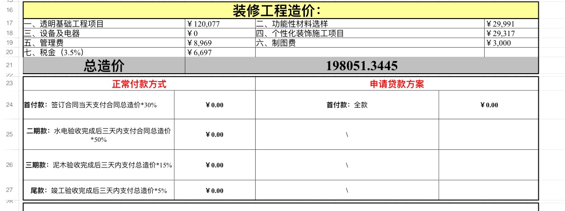 結(jié)果第一次面談方案,我們不太滿意。然后又是一個溝通也沒有的三天后,發(fā)來了他們的修改方案和預算,超過我們預期太多了接近20萬,我們普通家庭根本承受不了,我們只有10萬硬裝的預算。結(jié)果他們負責人就暗示我一些方法了,告訴我小院子或者定制櫥柜等可以私下找人解決,但是我明確告訴他我如果要裝修肯定是一個公司一個合同全部處理掉,不可能是一個房子找?guī)讉€裝修隊,否則我還要什么全包服務(wù)?