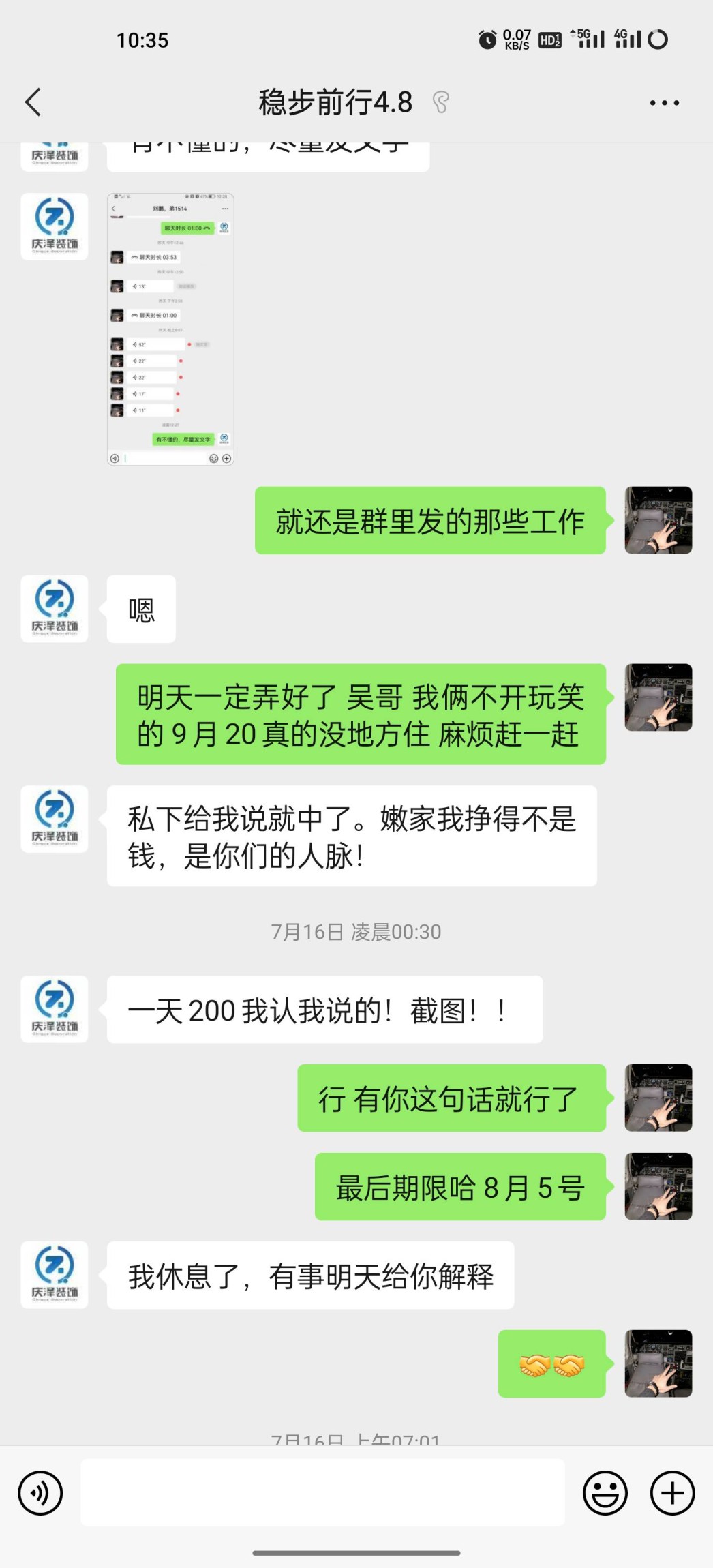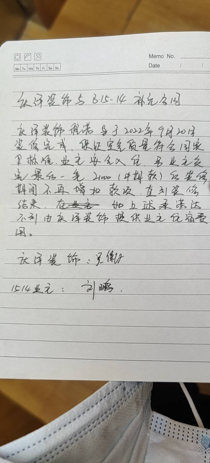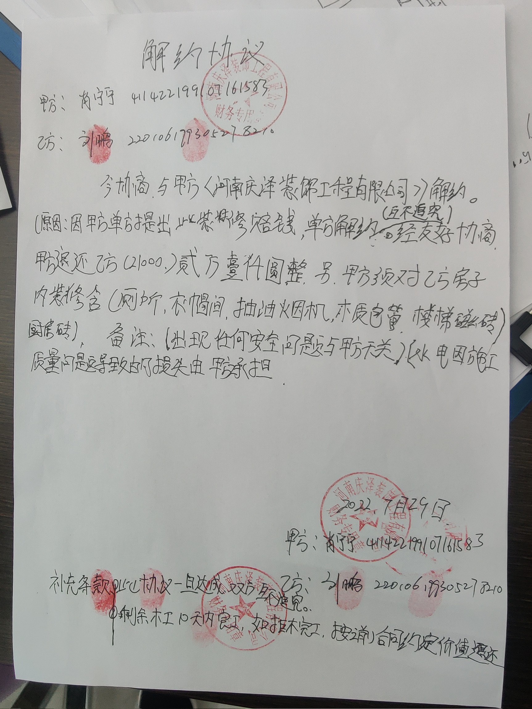 然后就到了矛盾的激發(fā)點(diǎn),我們簽的合同上規(guī)定了繳款方式,然而在木工還沒(méi)完工(二樓瓷磚沒(méi)貼完、飄窗旁的下水管沒(méi)包、廁所下水管沒(méi)包、墻體沒(méi)粉刷、樓梯踏步?jīng)]做外包的情況下)慶澤裝修公司開(kāi)始向我索要第三筆裝修金,我拿著合同說(shuō)第三筆是在木工安裝完成,成品安裝之前繳納第三筆裝修金,因?yàn)槲壹业墓褡邮茄b修公司合作的第三方品牌廠家做的成品柜,在我的理解是柜子已經(jīng)做好了,就差安裝我才交第三筆錢,但裝修公司不認(rèn),我又說(shuō)木工、墻、樓梯還都沒(méi)完成,這些顯然不是成品,我為什么要提前預(yù)支你們裝修金,對(duì)方態(tài)度很強(qiáng)硬,反正不交錢就停工,延誤的工期算業(yè)主原因(之前因?yàn)楹贤餂](méi)寫裝修時(shí)間,后面我和裝修老板談過(guò)裝修時(shí)間問(wèn)題,他給出的是8月5號(hào)完工,超出一天支付200元,這個(gè)有聊天截圖)。然后在經(jīng)過(guò)多次協(xié)商無(wú)果,我也次詢過(guò)很多機(jī)構(gòu),只能是幫助協(xié)調(diào)。因?yàn)閮r(jià)格最高的柜子還沒(méi)有完成,如果他現(xiàn)在不干了,前面已經(jīng)給的兩筆裝修款我們是虧得比較多的,所以我再次選擇妥協(xié),交付了第三筆裝修款,并讓對(duì)方簽了協(xié)議,請(qǐng)看截圖(主要是時(shí)間期限和后續(xù)裝修不能有任何的加強(qiáng)項(xiàng)目)。我本以為簽了這個(gè)協(xié)議可以讓他有所收斂,但沒(méi)想到在交錢后的第三天,就給我打來(lái)電話,(當(dāng)時(shí)我在睡覺(jué)他還說(shuō)沒(méi)事你先休息沒(méi)什么重要的事,回頭想想我估計(jì)他都沒(méi)臉說(shuō)了),告知我我家柜子超出預(yù)算了(反正就是要錢),說(shuō)我家柜子他預(yù)算是22平方,從始至終他都沒(méi)和我提過(guò)柜子的尺寸,因?yàn)楫?dāng)時(shí)簽的死單,我只和他說(shuō)了我家哪里哪里需要柜子,他并沒(méi)有去拿尺測(cè)量。然后突然告知我柜子是22平方,我就問(wèn)他哪里來(lái)的22平這個(gè)數(shù)據(jù),對(duì)方也給不出答案。合同里每項(xiàng)柜子是有尺寸的,應(yīng)該是之前對(duì)接的設(shè)計(jì)師量過(guò),合同上的柜子平方是27.24,柜子廠家量的是29.078,所以就算按合同上執(zhí)行,也是超出了1.8338個(gè)平方。我與對(duì)方協(xié)商我補(bǔ)齊這1.8338平方的錢給柜子廠家,他把柜子的錢給廠商,柜子就開(kāi)始加工生產(chǎn),一開(kāi)始他同意這個(gè)方案,并同意次日一起去柜子廠家把事情解決,然而次日他又一再推脫,最終私自和柜子廠商協(xié)商,我家的柜子他去買材料再由柜子廠商加工。在得到我的不同意后,他再次說(shuō)要不干了。