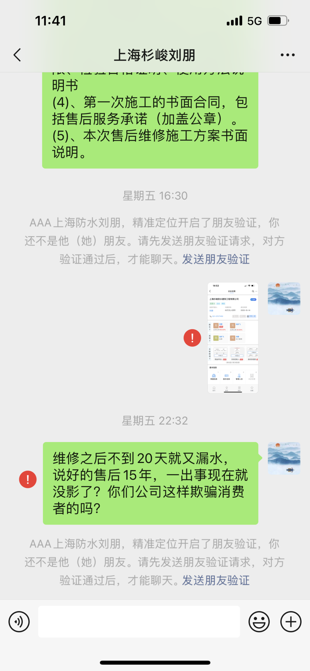 2022年3月13日,我在淘寶電商平臺上找到“雨虹防水補(bǔ)漏維修施工”店鋪,咨詢防水問題,通過客服委派,接到上海杉峻防水建筑工程有限公司法人劉朋電話,宣稱其為東方雨虹品牌授權(quán)商,承諾質(zhì)保期15年。2022年7月6日,我委托劉朋派人上門進(jìn)行裝修裝飾服務(wù),地點(diǎn)位于普陀區(qū)中江路1067弄50號302室,施工人員為劉慶飛(該公司股東、監(jiān)事,同時(shí)也是上海杜憬菲防水建筑工程有限公司法人)。在施工前,該人員未提供營業(yè)執(zhí)照、合同文件和材料質(zhì)量證明,不預(yù)估用量,只說按注膠材料重量算錢。施工完成后,以各種理由誘騙我繞開淘寶平臺,線下向其轉(zhuǎn)款7200元,留下手寫收據(jù),并信誓旦旦質(zhì)保15年。2022年7月27日,我發(fā)現(xiàn)漏水問題沒有解決,要求劉朋、劉慶飛再次上門進(jìn)行維修,遭到拒絕;同時(shí),他們拒絕提供施工資質(zhì)證件、材料質(zhì)量證明及品牌授權(quán)證明,并拒接我的電話、拉黑我的微信。我試圖通過原淘寶店鋪“雨虹防水補(bǔ)漏維修施工”與對方聯(lián)系,發(fā)現(xiàn)該店鋪涉嫌詐騙已關(guān)閉。