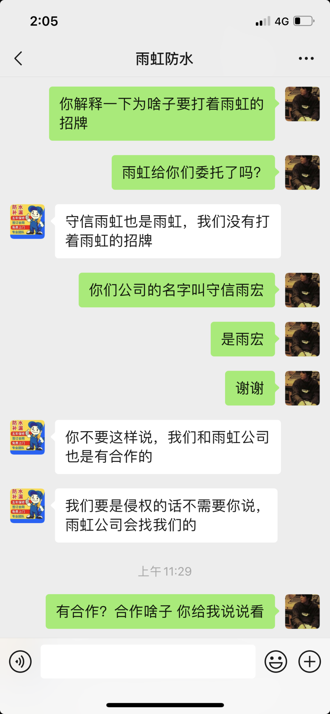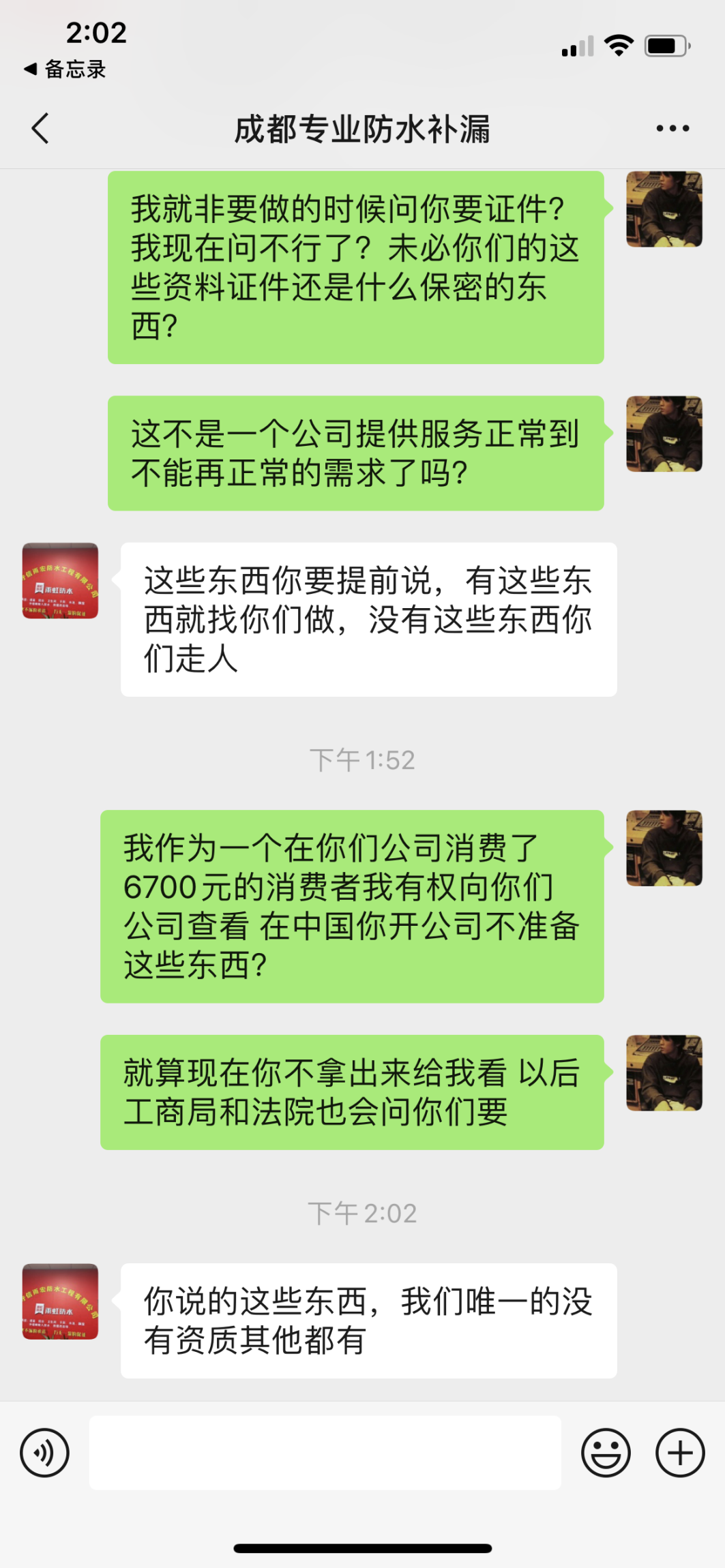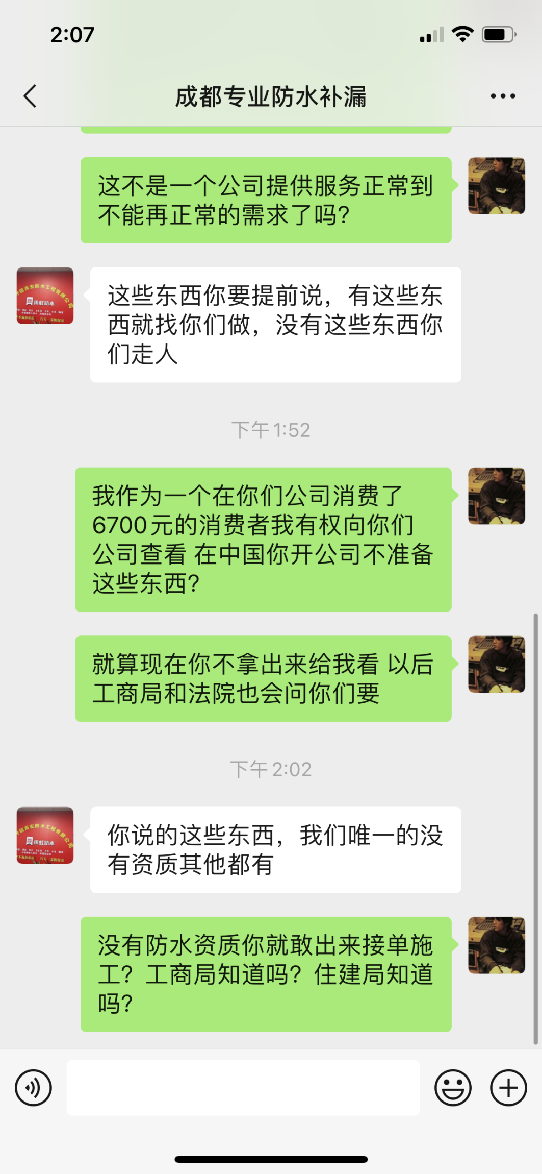 | 投訴類型 | 其它 | 投訴人 | 史** | 被投訴單位 | 成都守信雨宏防水工程有限公司 |