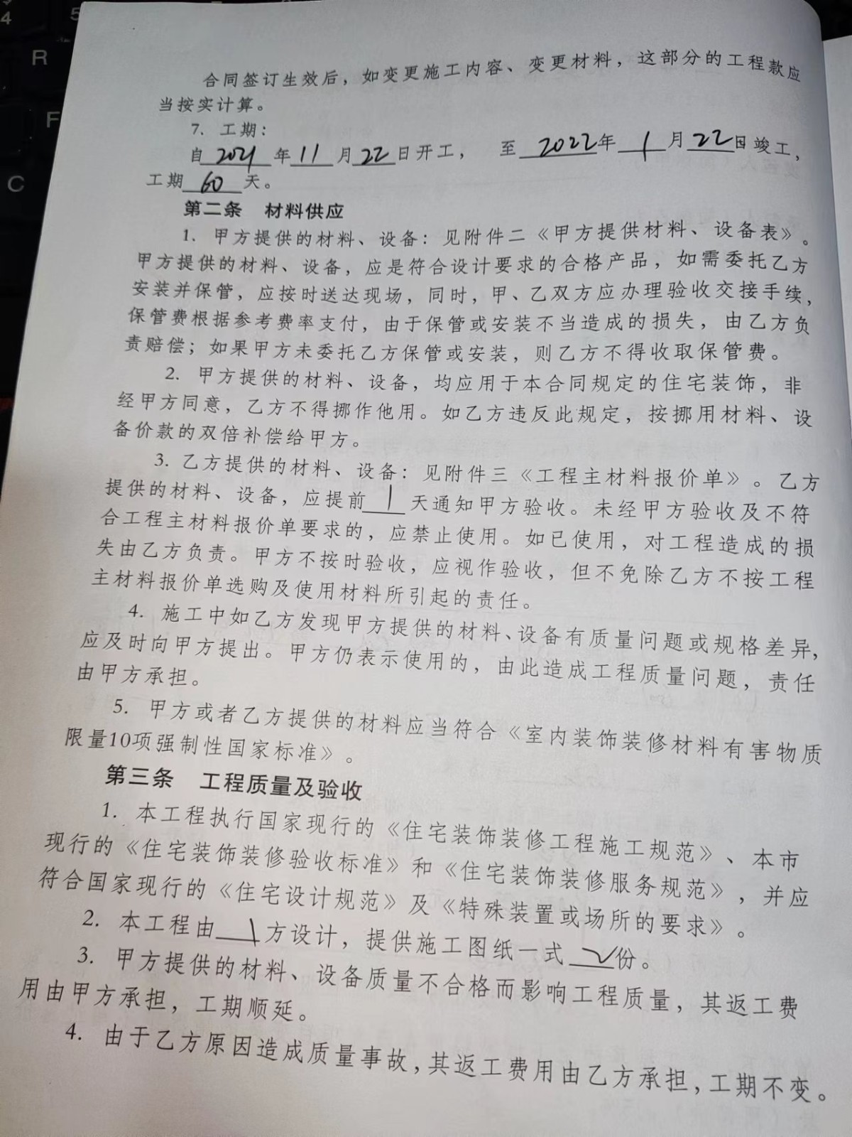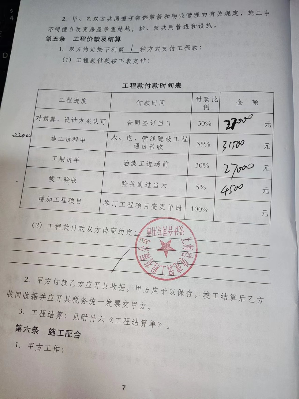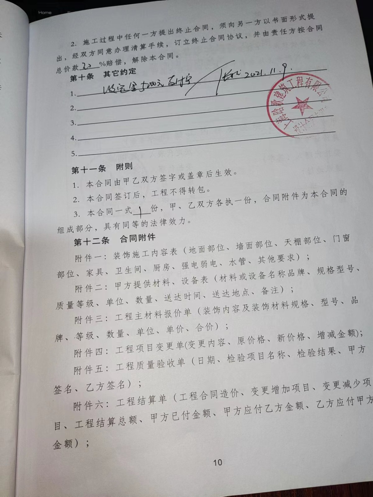 我于2021年11月9日與上海晗歌建筑裝飾工程有限公司簽訂了裝修合同,房屋所在地是上海市金山區(qū)龍山路836弄17幢501室,房屋套內(nèi)面積是114平米,合同約定2021年11月22日開工至2022年1月22日竣工。合同承包方式為全包,合同總價9萬元整。我已經(jīng)按照合同約定如期付款,剩余尾款4500元沒有支付。我是商用房簡單裝修,但現(xiàn)在存在較多問題,一直是抱著息事寧人的態(tài)度和他們協(xié)商處理趕緊交房,但一直拖延催牛陰奉陽違,我實在沒辦法了,只能在2022年8月11號在微信群里發(fā)布解除合同。我打了12345通過閔行區(qū)消保委也無果?,F(xiàn)在我都有視頻取證,包括打了12345后他們在2022年8月16號拍人過來協(xié)調(diào),也全程錄音錄像,但是視頻都太大了我現(xiàn)在沒法上傳。這家公司我事后發(fā)現(xiàn)他們合同上也沒留下電話號碼,所有事情都是在微信群中聯(lián)系,問他們要過幾次,他們也不給,我只有他們微信號和客戶電話18721711921.