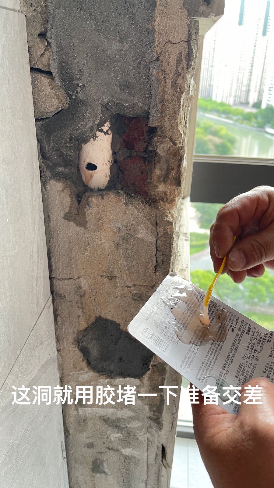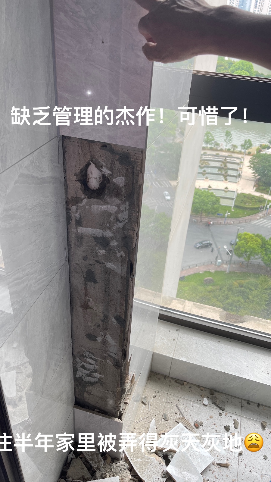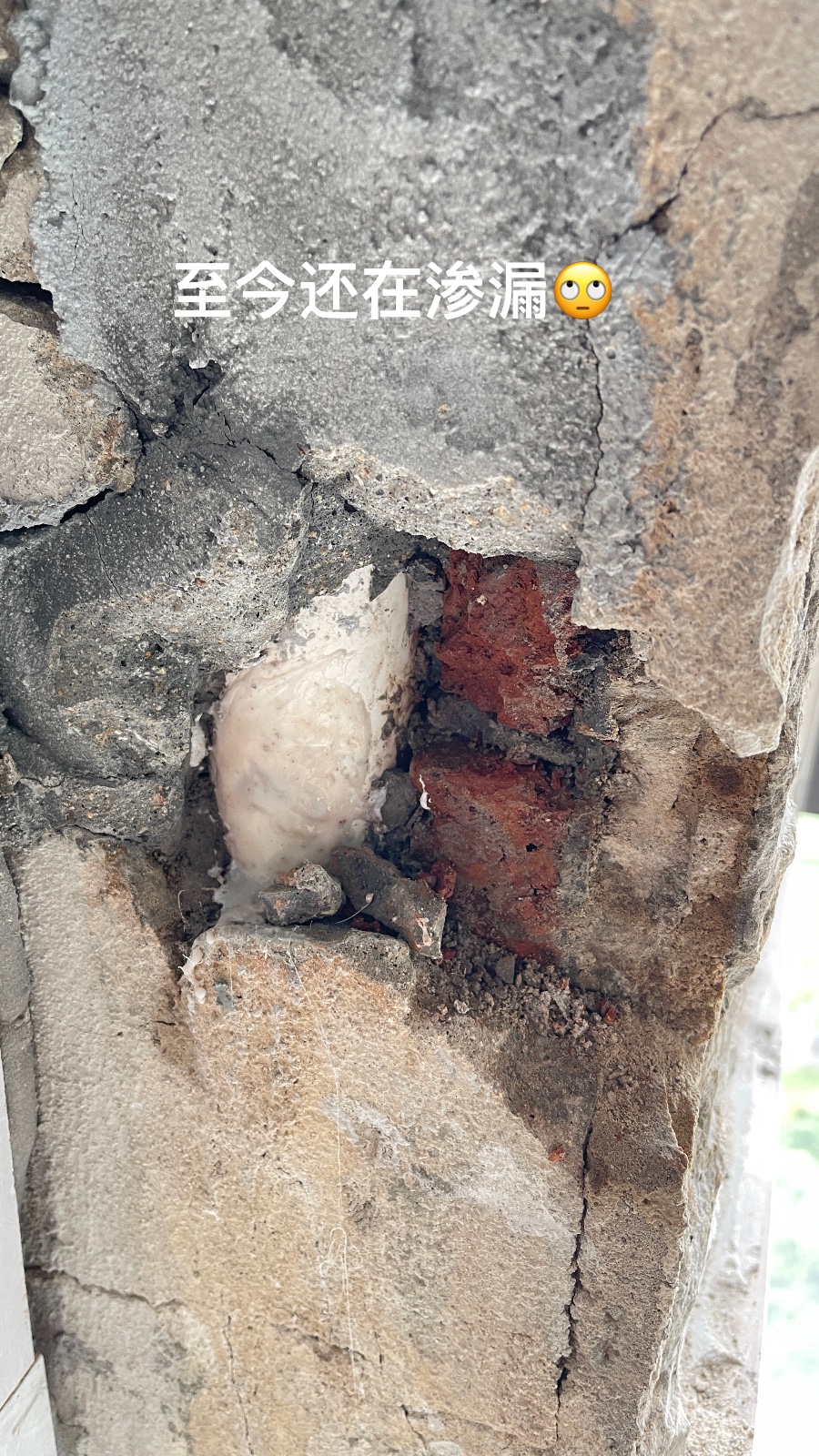 6.今天2022年8月19日,入住不到半年,突然發(fā)現(xiàn)主臥踢腳線下有水!早上8點馬上至電售后,中午12點工人抵達(dá),查看并敲掉了陽臺上的墻磚,發(fā)現(xiàn)空調(diào)下水管上有個破洞(一看又是人為用硬器擊的!有照片)問后得知這二十多年前的管子也根本沒換過,施工隊長還說當(dāng)時看了沒壞就沒換,那請問拆舊的管子只要不漏都不用換嗎?問題找到后當(dāng)天用水泥堵上,讓觀察一夜,結(jié)果還在漏,他當(dāng)場有承諾把墻全部搞掉換管子,到這地步我們也只能認(rèn)了~又過了一天(管子一直在滲水)等到晚上5點終于來了,可帶來的是膠水!不是管子~今天已是上膠水的第三天-~想想真的害怕不知后面是否還會發(fā)生什么事,修復(fù)過程新家被弄得灰天灰地~現(xiàn)在不想忍了,這種惡劣行為必須曝光!且尚海整裝應(yīng)作出賠償!