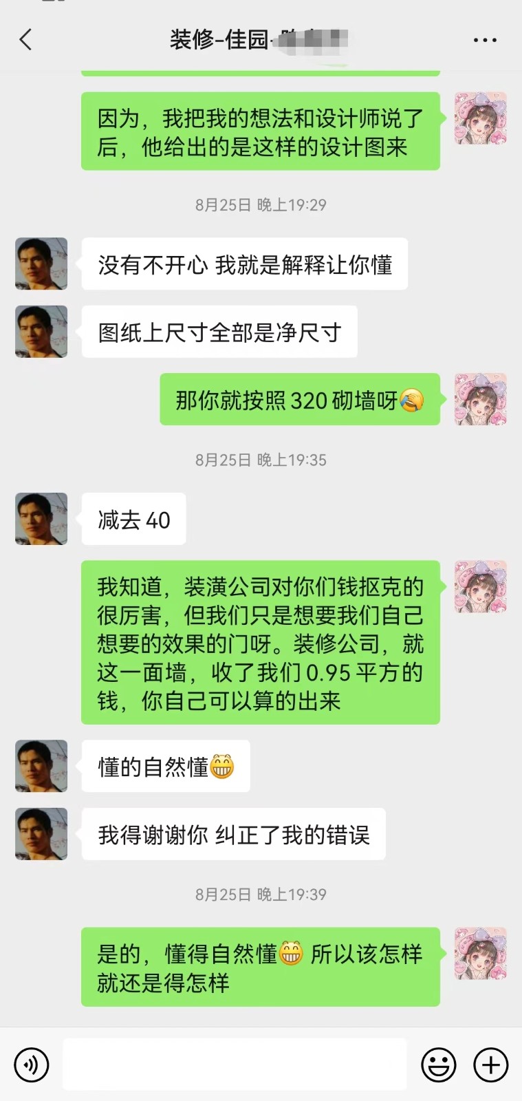 8.25日,合約內(nèi)設(shè)計圖紙的砌墻尺寸為320mm,項目經(jīng)理只砌了200mm,我方當(dāng)即要求對方按照圖紙施工,但對方堅持不改,設(shè)計總監(jiān)還附和說砌墻圖紙上標(biāo)了并不存在的完成面尺寸,且回避了圖紙上的實際尺寸。在我方與項目經(jīng)理的微信溝通后,最終于8.26日在我方讓步下補了50mm墻體。