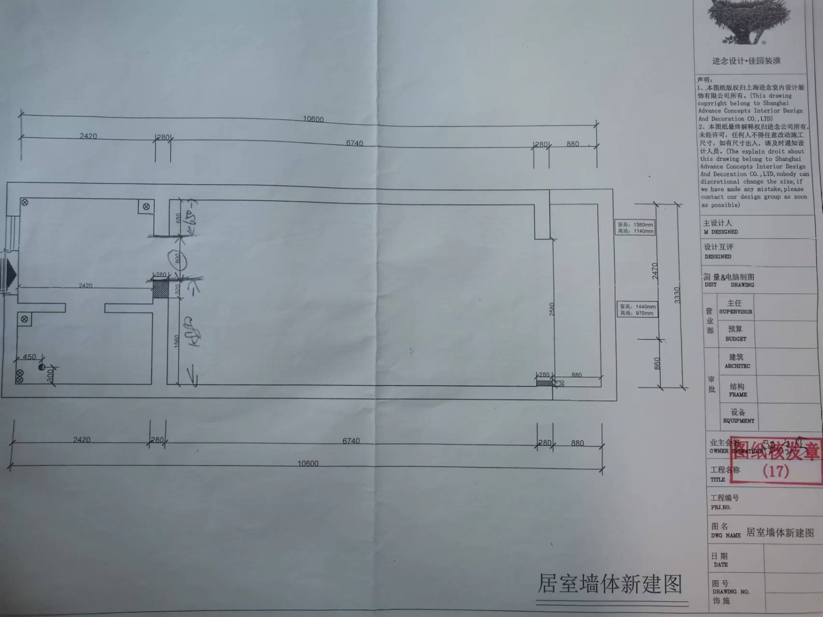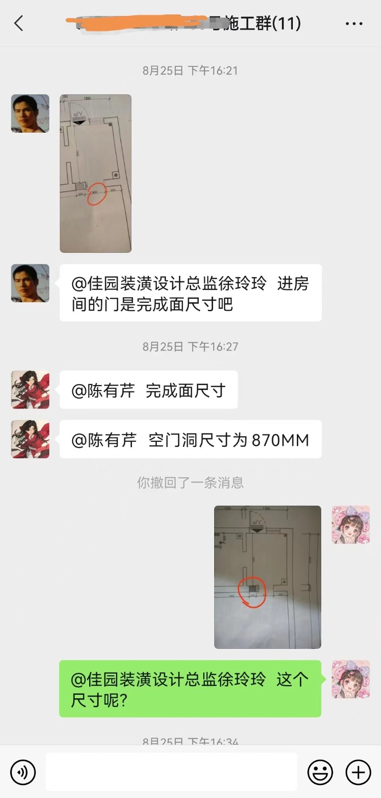 8.30日,項目經(jīng)理未經(jīng)我方確認(rèn),擅自對旁邊的墻體進行二次拆除,性質(zhì)及其惡劣。在微信上讓設(shè)計師出來說明尺寸問題時,負(fù)責(zé)這個項目的設(shè)計師及監(jiān)理均回復(fù)已離職。我方始終要求裝潢公司按合同約定的圖紙尺寸施工,但對方設(shè)計總監(jiān)及項目經(jīng)理卻強行要求我方必須接受合同約定的圖紙上并不存在的“完成面”尺寸870。