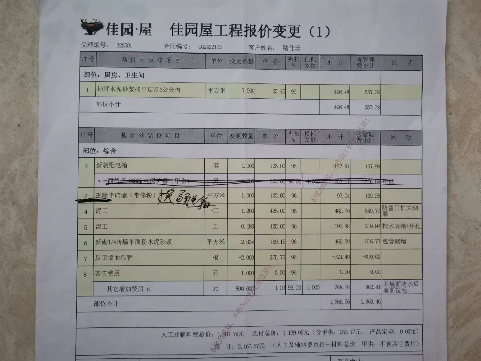 8.4日電工進場時,項目經(jīng)理指出了全屋各處需要費用增加的地方并開口要價,我方要求裝修公司協(xié)商解決,但設(shè)計總監(jiān)多次推脫,并讓我方私下和項目經(jīng)理溝通協(xié)商費用,均被我方拒絕,最后在我方的一再堅持下,設(shè)計總監(jiān)給出一份,合同約定項目內(nèi)仍然需再付費的,她所謂的項目變更單。為了不拖延施工進度,我方妥協(xié)了,并付了款。
