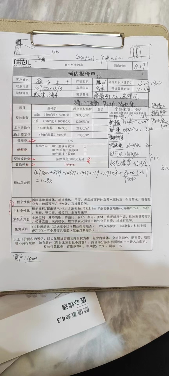 8月底找到對方溝通,因為預(yù)算比較緊張,是算好了全屋的落地預(yù)算后再來溝通報價的。當(dāng)時接待的客戶經(jīng)理(銷售)按照我們的設(shè)計圖紙出的報價是12.2萬(原價12.8萬),全屋窗戶1.3萬,我們在計算完這個價格可以后才交了3000意向金繼續(xù)推進。