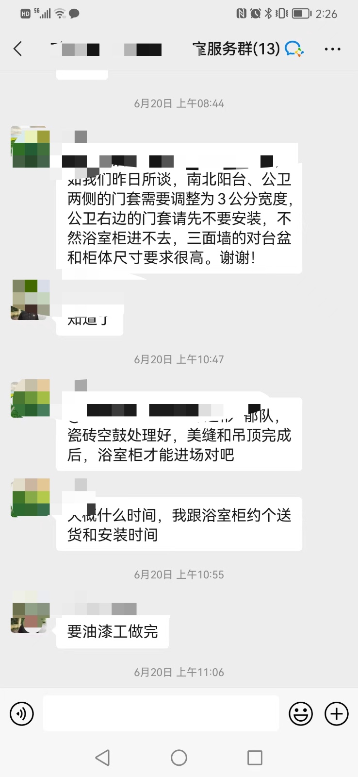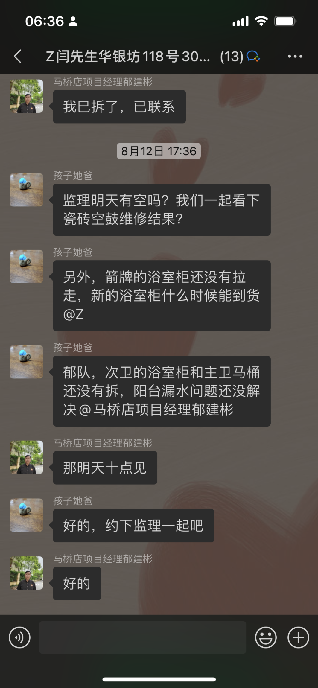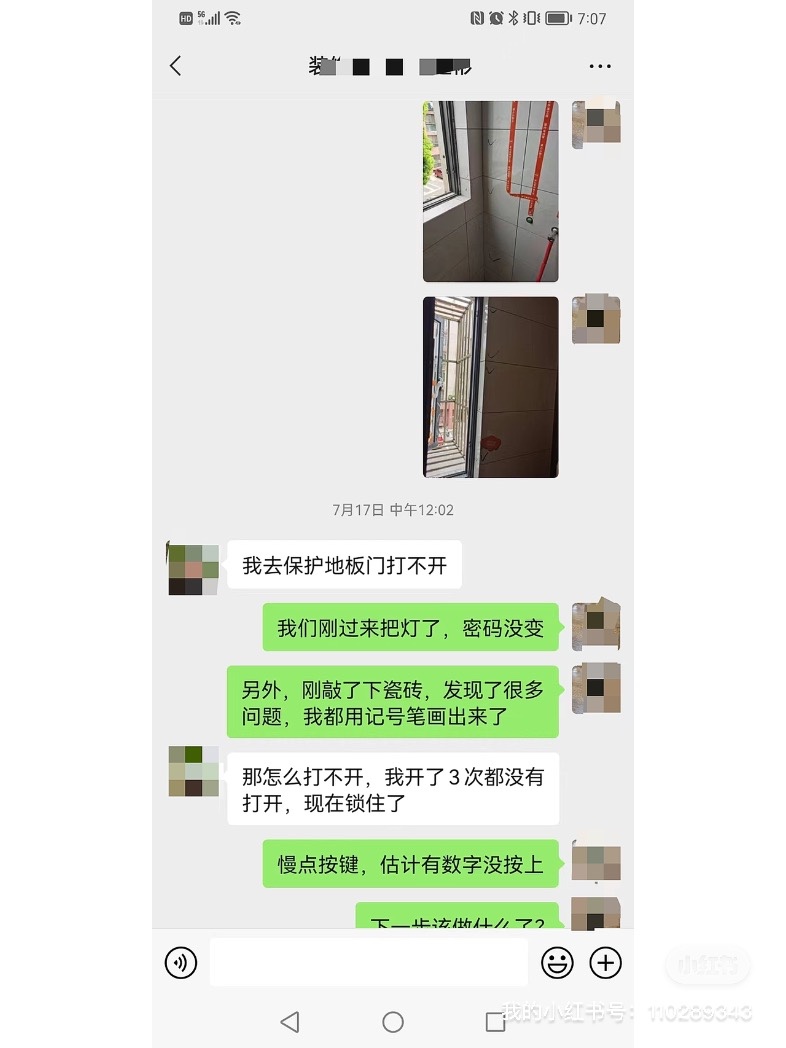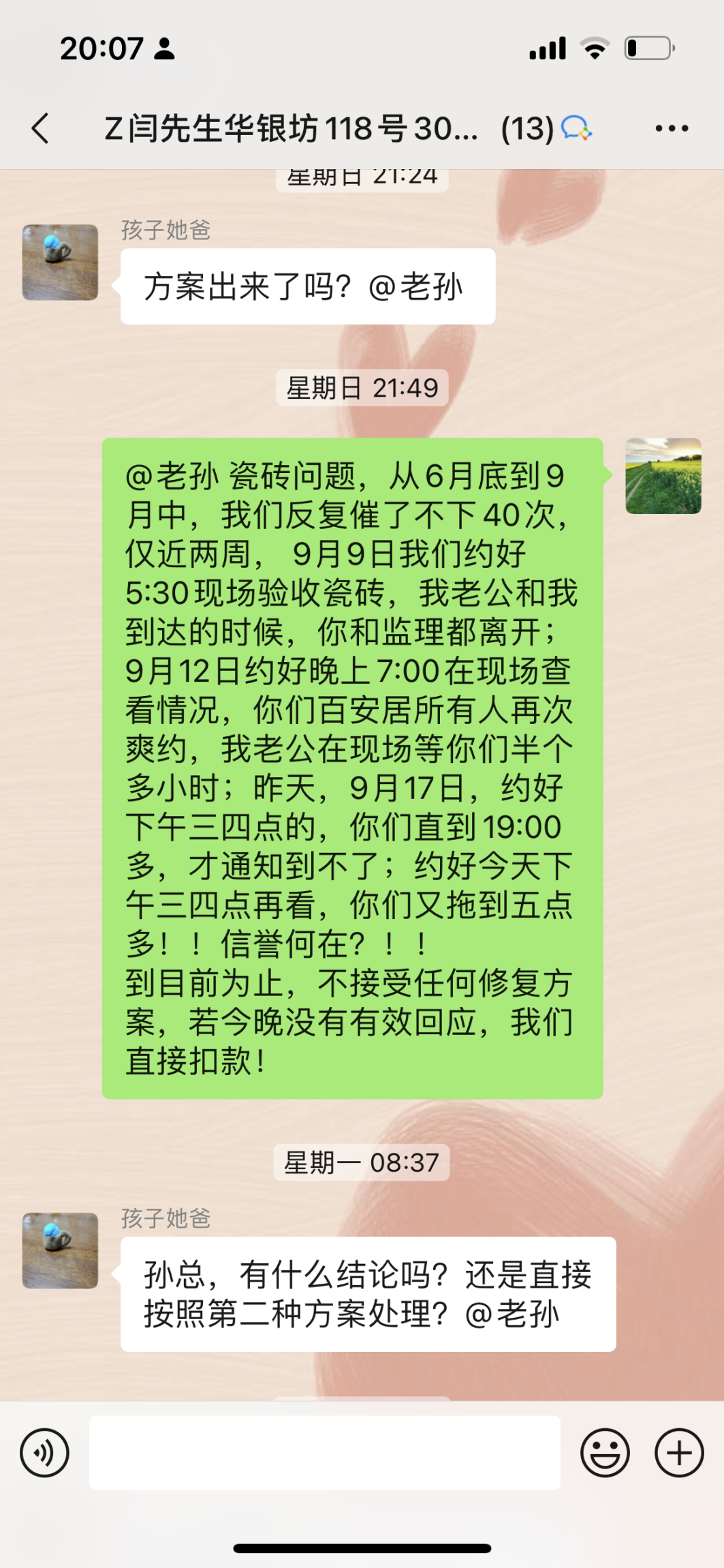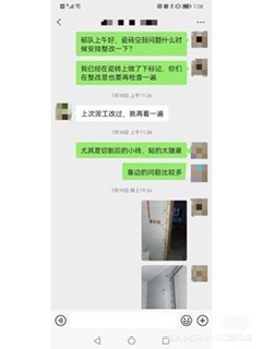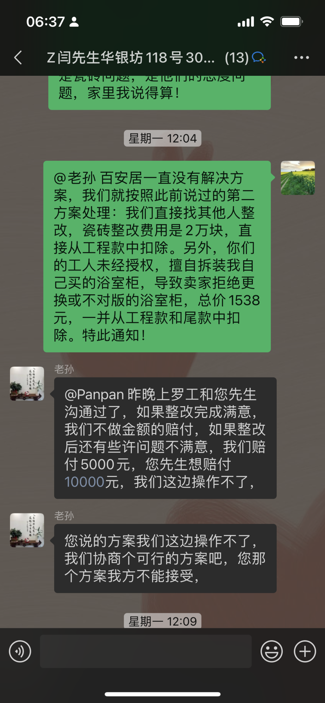我方在微信群里表明,9/18 日是最后一次機(jī)會(huì),百安居監(jiān)理羅先生以我們需要耗費(fèi)大量精力取質(zhì)量檢驗(yàn)公正為由,脅迫我先生接受 5000 元的賠付,我們拒絕了。截止到目前為止,百安居無(wú)人再出面溝通此事。
