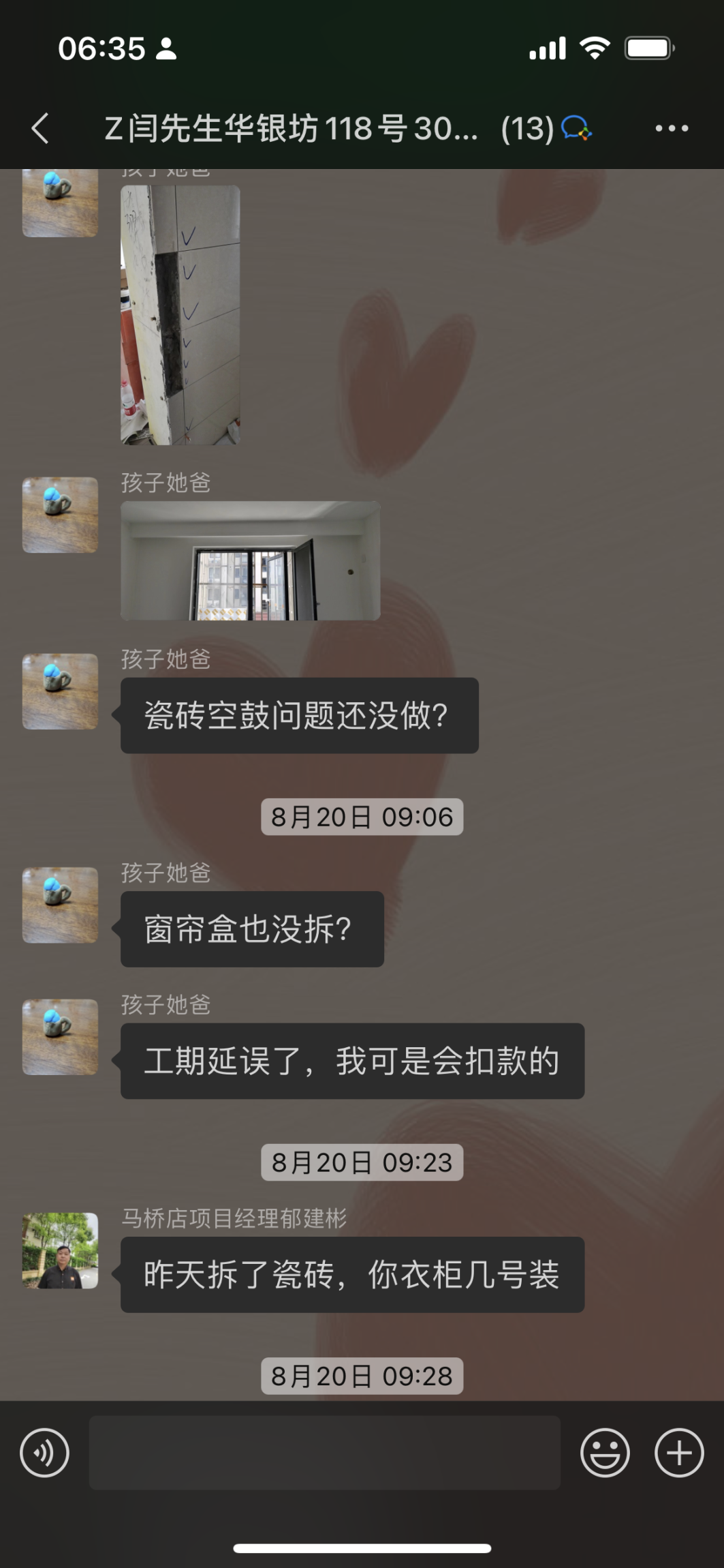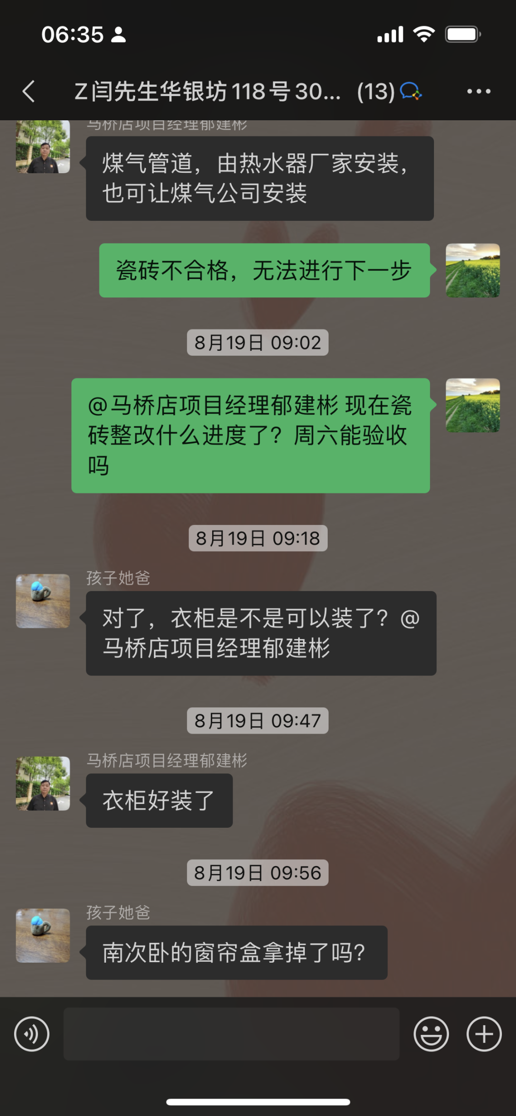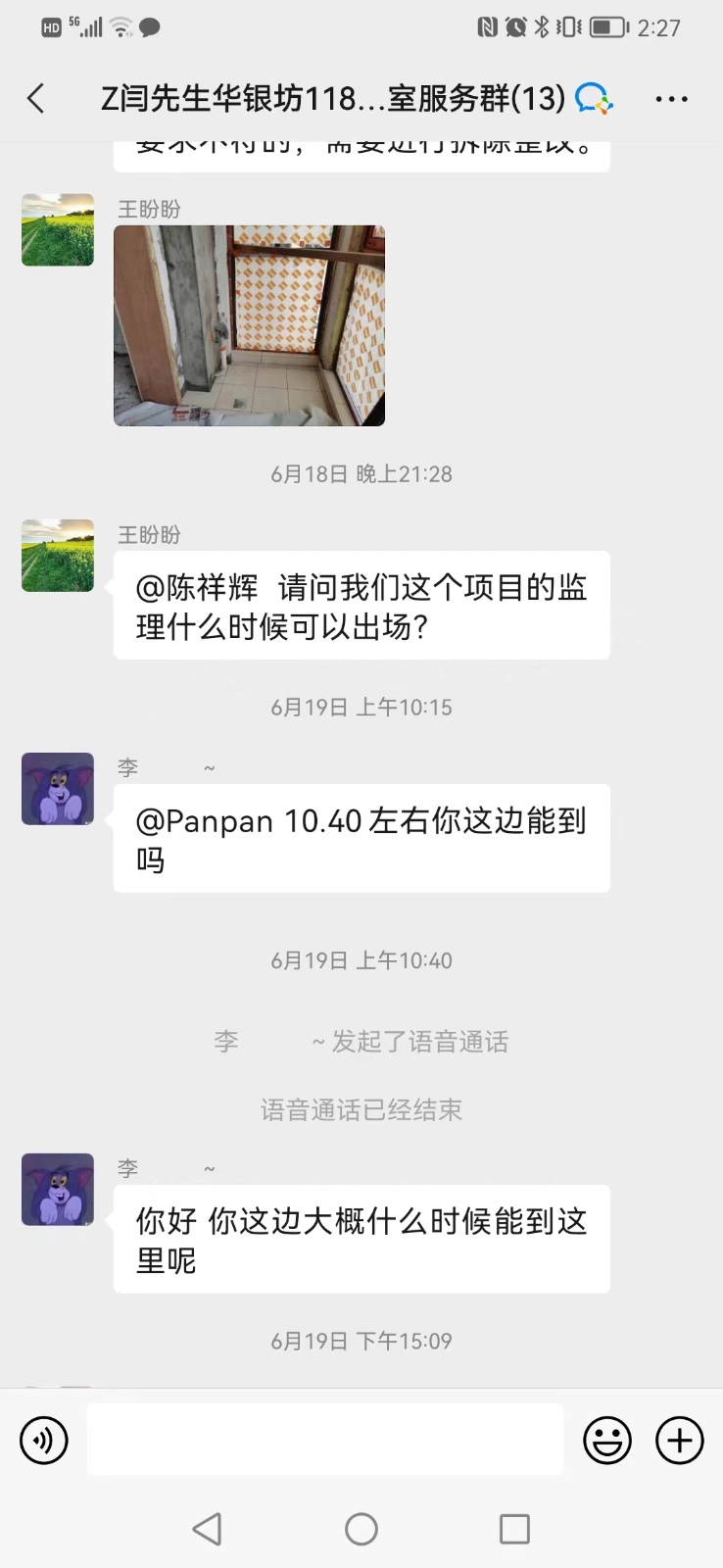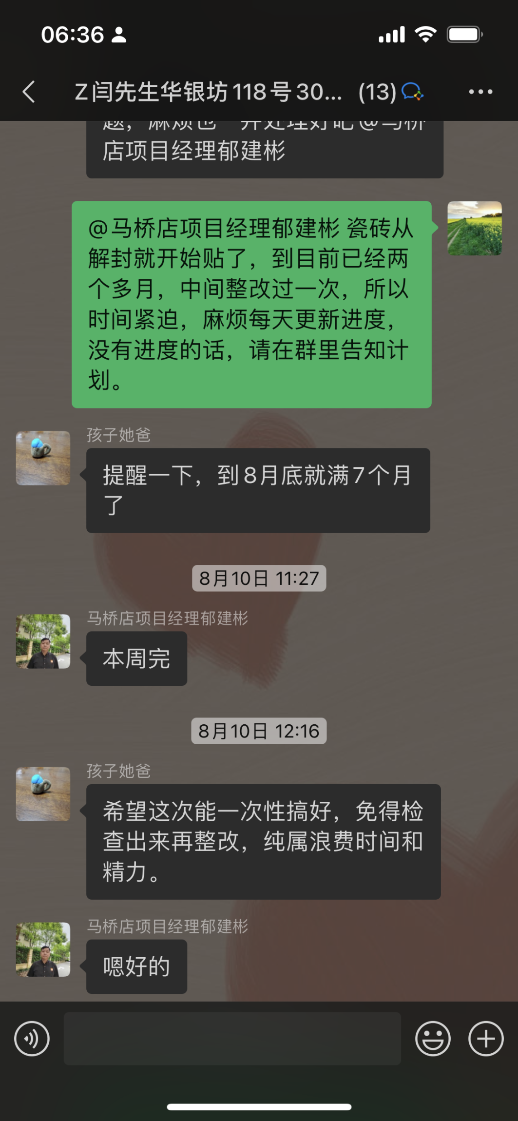 我方在微信群里表明,9/18 日是最后一次機(jī)會(huì),百安居監(jiān)理羅先生以我們需要耗費(fèi)大量精力取質(zhì)量檢驗(yàn)公正為由,脅迫我先生接受 5000 元的賠付,我們拒絕了。截止到目前為止,百安居無(wú)人再出面溝通此事。
