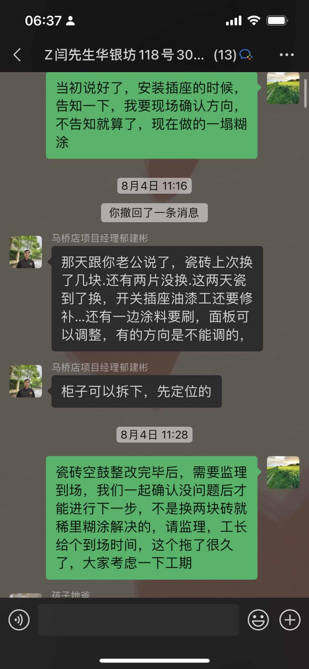 2022.6.19,我方和百安居工長(zhǎng)和監(jiān)理約定現(xiàn)場(chǎng)瓷磚驗(yàn)收,經(jīng)雙方確認(rèn),瓷磚大面積空鼓,驗(yàn)收不合格,需要進(jìn)行整改,百安居工長(zhǎng)答應(yīng)進(jìn)行一周檢查整改,從6.19日起,我方經(jīng)過反復(fù)催促,百安居進(jìn)行多輪承諾,整改,驗(yàn)收,均不合格,且每次都要求再給一周時(shí)間。截止到 2022.9.22 日,我方進(jìn)行多方面包括當(dāng)面、電話、微信催促,店內(nèi)投訴,百安居客服等多種方式催促,協(xié)商,溝通,均未得到有效整改。于此同時(shí),店長(zhǎng)、監(jiān)理和工長(zhǎng)和我方約定時(shí)間,進(jìn)行現(xiàn)場(chǎng)查看,卻一而再,再而三爽約。僅僅是9月兩周時(shí)間內(nèi)就爽約三次:9月9日,約定下午5:30,現(xiàn)場(chǎng)驗(yàn)收,我和先生趕到時(shí),店長(zhǎng)和監(jiān)理均已離開;9月 12 日約好晚上7:00. 店長(zhǎng)因?yàn)樗麄內(nèi)藛T不能到齊為由,再次失約;9 月 17日,約好下午4:00, 他們?cè)俅问Ъs。