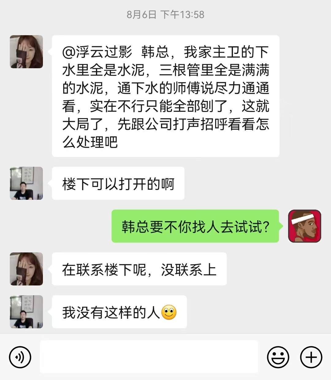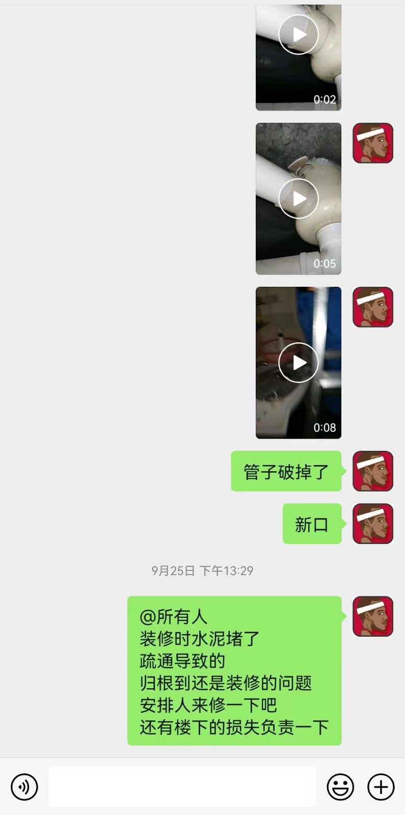 1)主衛(wèi)客衛(wèi)下水管水泥堵塞,讓公司處理,無人理會。無奈自己找管道疏通,費用2650元。由于水泥堵塞嚴重,導致疏通時樓下排水管破裂,讓公司安排處理,無人理會。目前還在維修中。