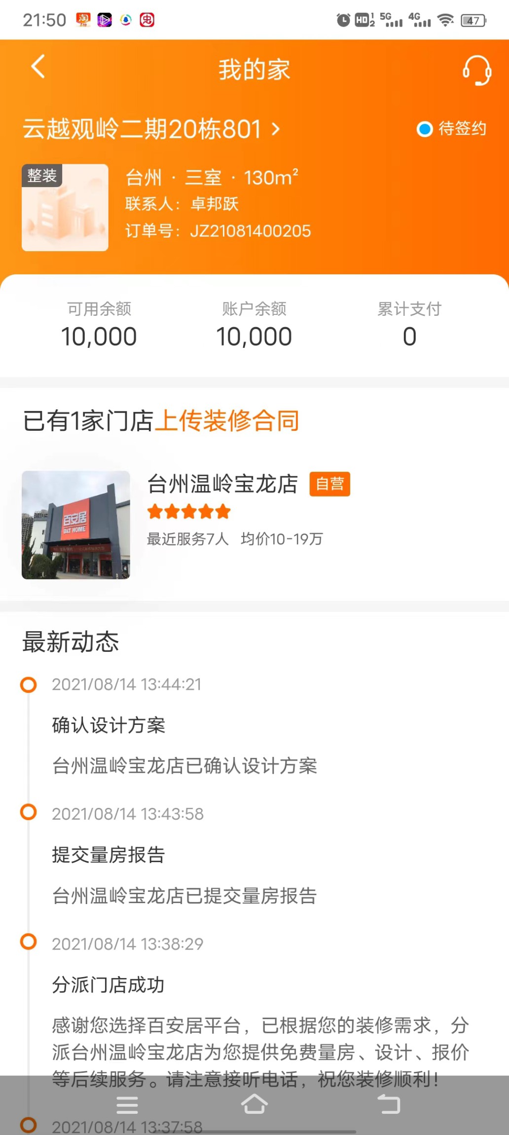 2021年8月14日,本人在百安居溫嶺寶龍店交了10000元裝修訂金,今年7月份發(fā)現(xiàn)該店已閉店,聯(lián)系以前的聯(lián)系人均宣稱已離職,隨后向百安居上海總部投訴要求進行退款,后一自稱臺州地區(qū)負責(zé)人的人聯(lián)系說未閉店,員工在培訓(xùn),只是暫時停業(yè)。通過管網(wǎng)發(fā)現(xiàn)該店確已閉店。