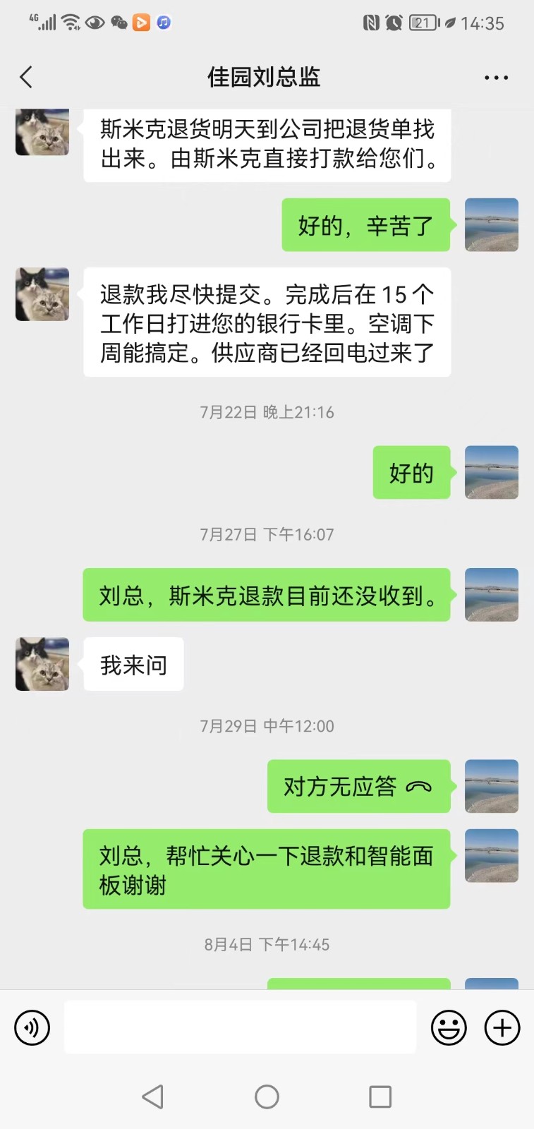 本人于2021年11月與進(jìn)念佳園裝潢公司簽訂裝修合同,按合同約定,合同款共計(jì)十二萬余元,應(yīng)于2022年3月22日完工。裝修期間公司管理混亂,預(yù)收款已有衛(wèi)生間移門收費(fèi),又把陽臺(tái)移門款項(xiàng)誤記做衛(wèi)生間內(nèi)移門,導(dǎo)致衛(wèi)生間移門被收費(fèi)二次(安裝只有一次),然后告知無費(fèi)用所以陽臺(tái)移門不安裝,多次要求核對賬單,但對方處理拖沓,無人理會(huì),所謂“裝修管家不知所蹤”,直至二月后投訴至北區(qū)最高領(lǐng)導(dǎo)方才查明款項(xiàng)去向,以致工程拖拉三個(gè)多月。7月2日按合同口頭約定賠付6000元,15個(gè)工作日內(nèi)到賬,但至今三個(gè)多月仍未到賬。多次聯(lián)系對方電話不接,微信不回,明顯逃避責(zé)任。
