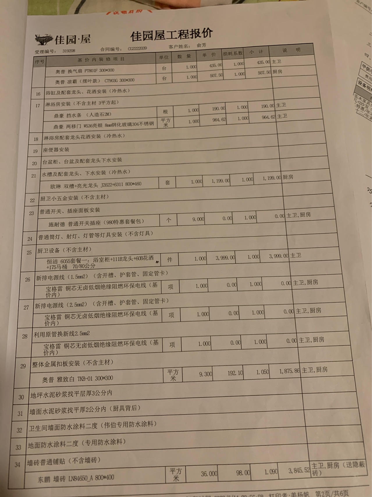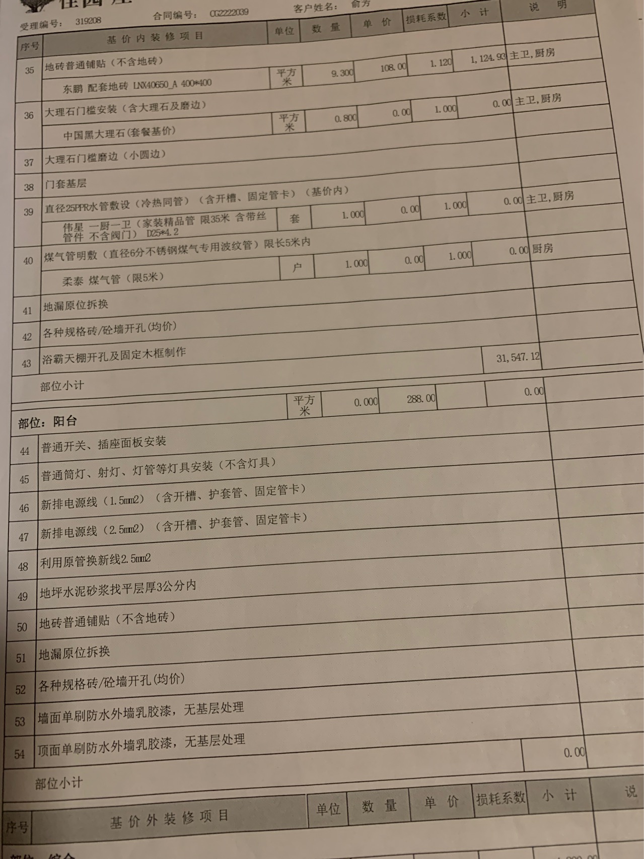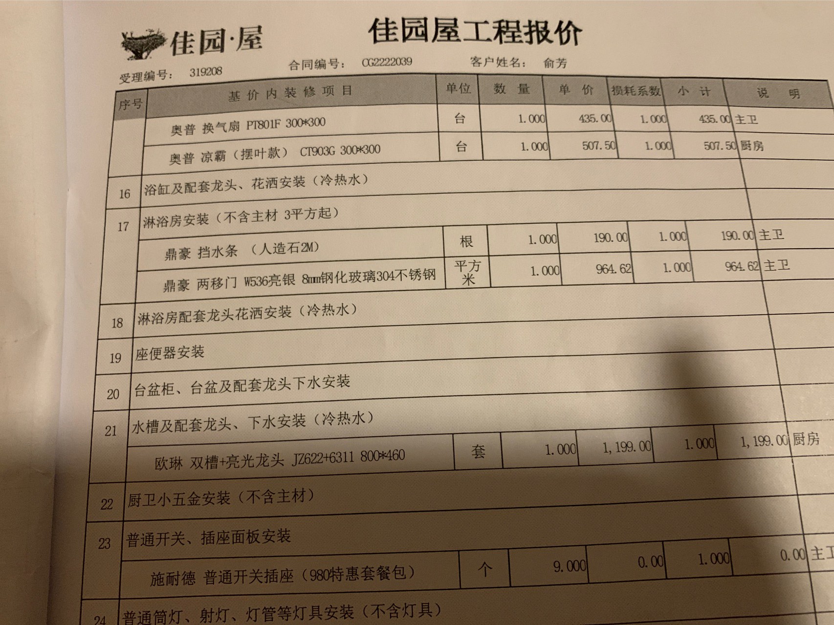 9.18工程正式開工,期間屢屢出現(xiàn)增項超預(yù)算情況,如墻面問題,當(dāng)初佳園與我方口頭協(xié)商答應(yīng)墻面鏟除至紅磚,實(shí)際施工時佳園方突然否認(rèn)這一說法并稱合同條款并不存在這點(diǎn)(事實(shí)確實(shí)不存在這一條款,但正如上文所說合同是佳園在通過各種方式手段故意利用客戶的不明就里而簽訂),導(dǎo)致我方不得不支付相關(guān)超支費(fèi)用。最嚴(yán)重當(dāng)屬淋浴房安裝,合同報價居然按1平方來做的報價,試問誰家淋浴房只有1平方?佳園做裝修報價時是何居心?而實(shí)際報價出來則要求我方支付6千,超出報價整整5千!