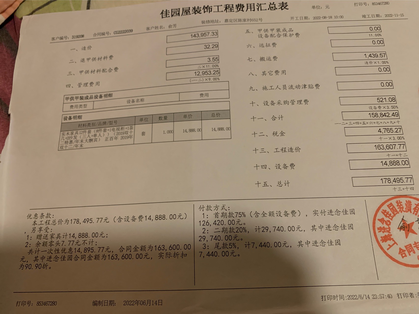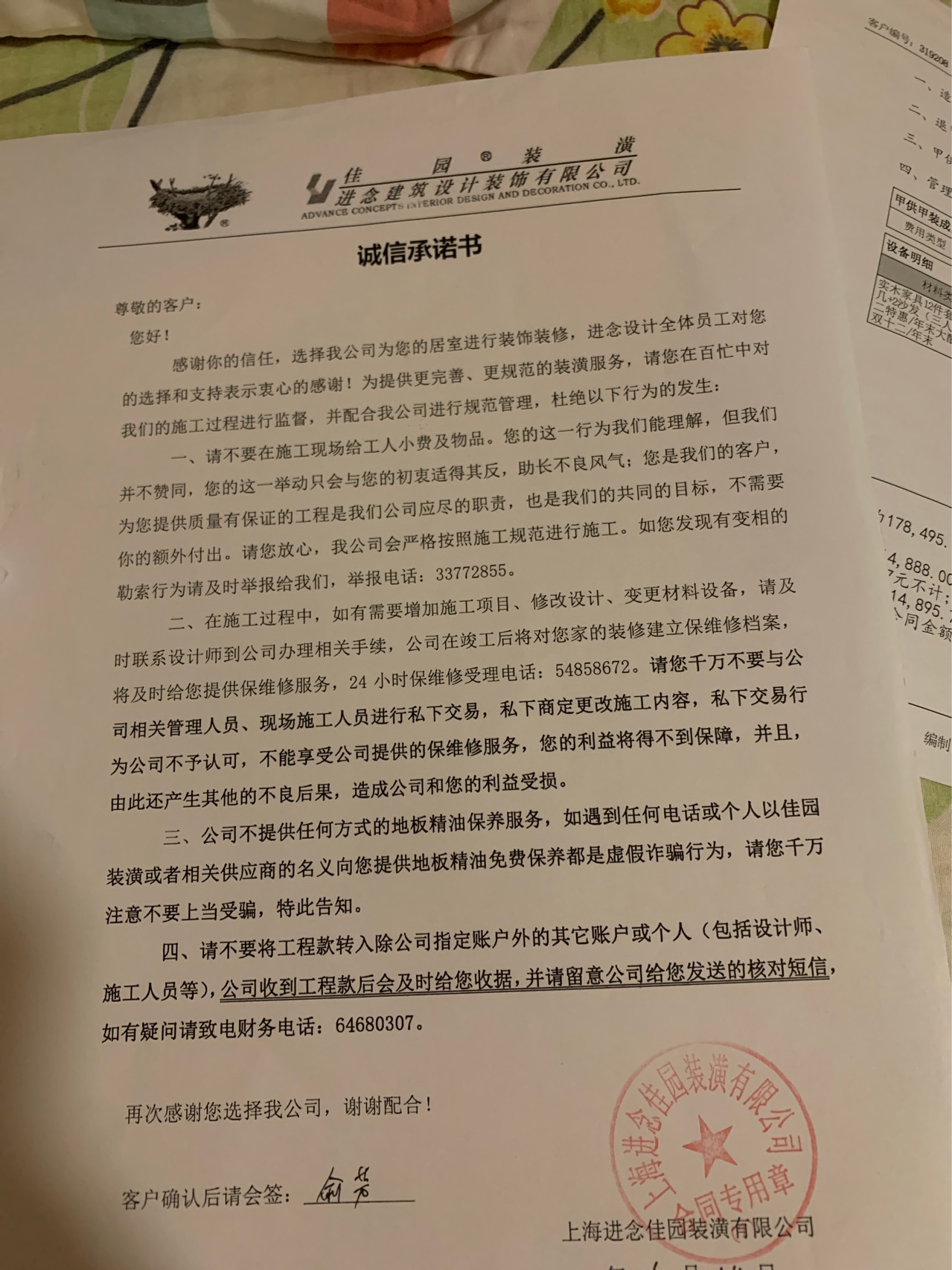 我們通過電視節(jié)目《超級裝》了解到上海進(jìn)念佳園裝潢有限公司,之后參觀了他們公司的良好環(huán)境,佳園方也展示了頗具效果的設(shè)計初稿,再之后佳園方特地選擇工作日晚上與我方周旋,一定程度上利用了我方對裝修領(lǐng)域的未知信息差及工作日晚上的疲憊心理狀態(tài),加之設(shè)計師及其領(lǐng)導(dǎo)蓄意的糖衣炮彈及畫大餅,我方于6.14晚,其實(shí)是6.15凌晨與其正式簽訂合同,并在并不知道定金不能退的情況下支付一萬塊定金。