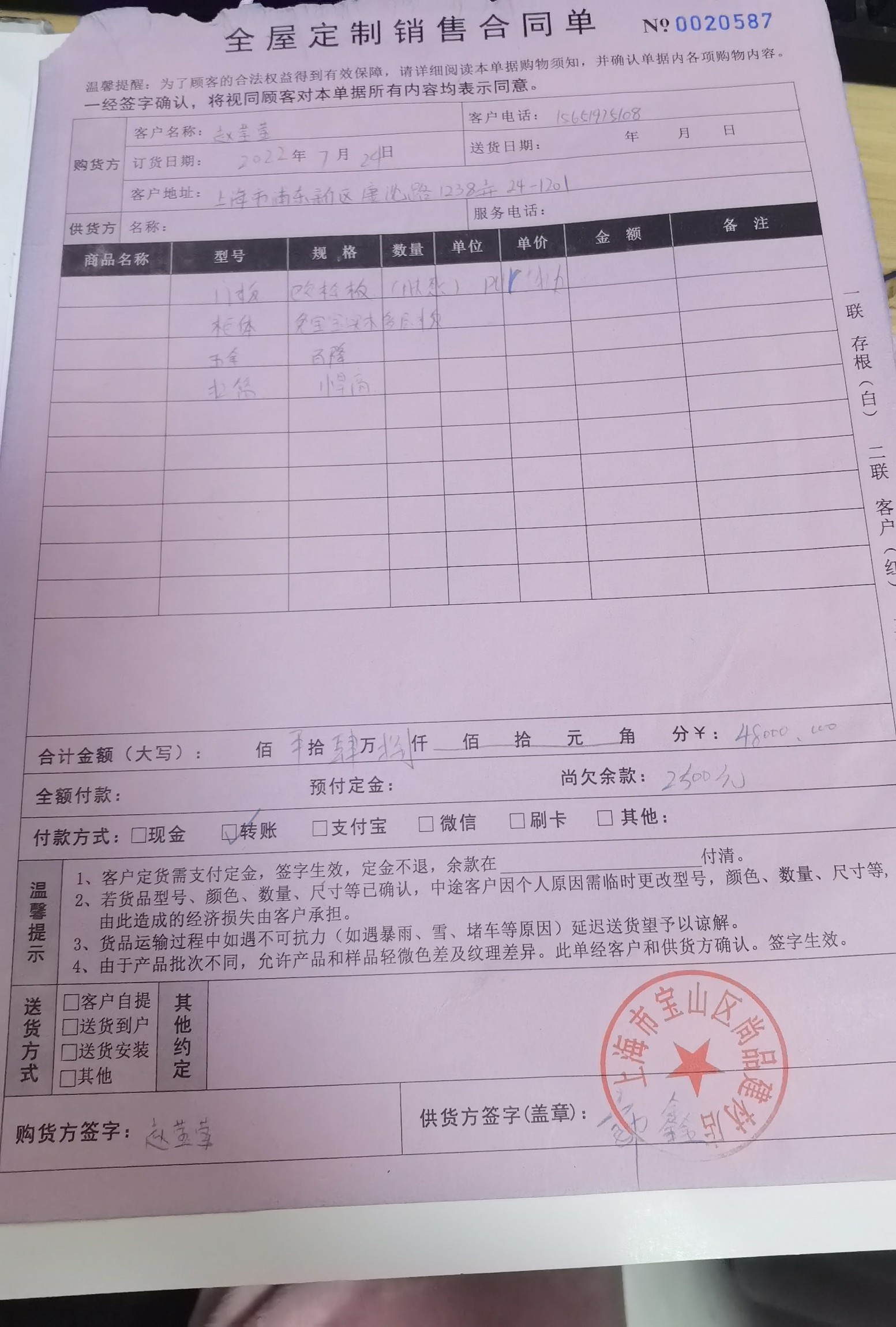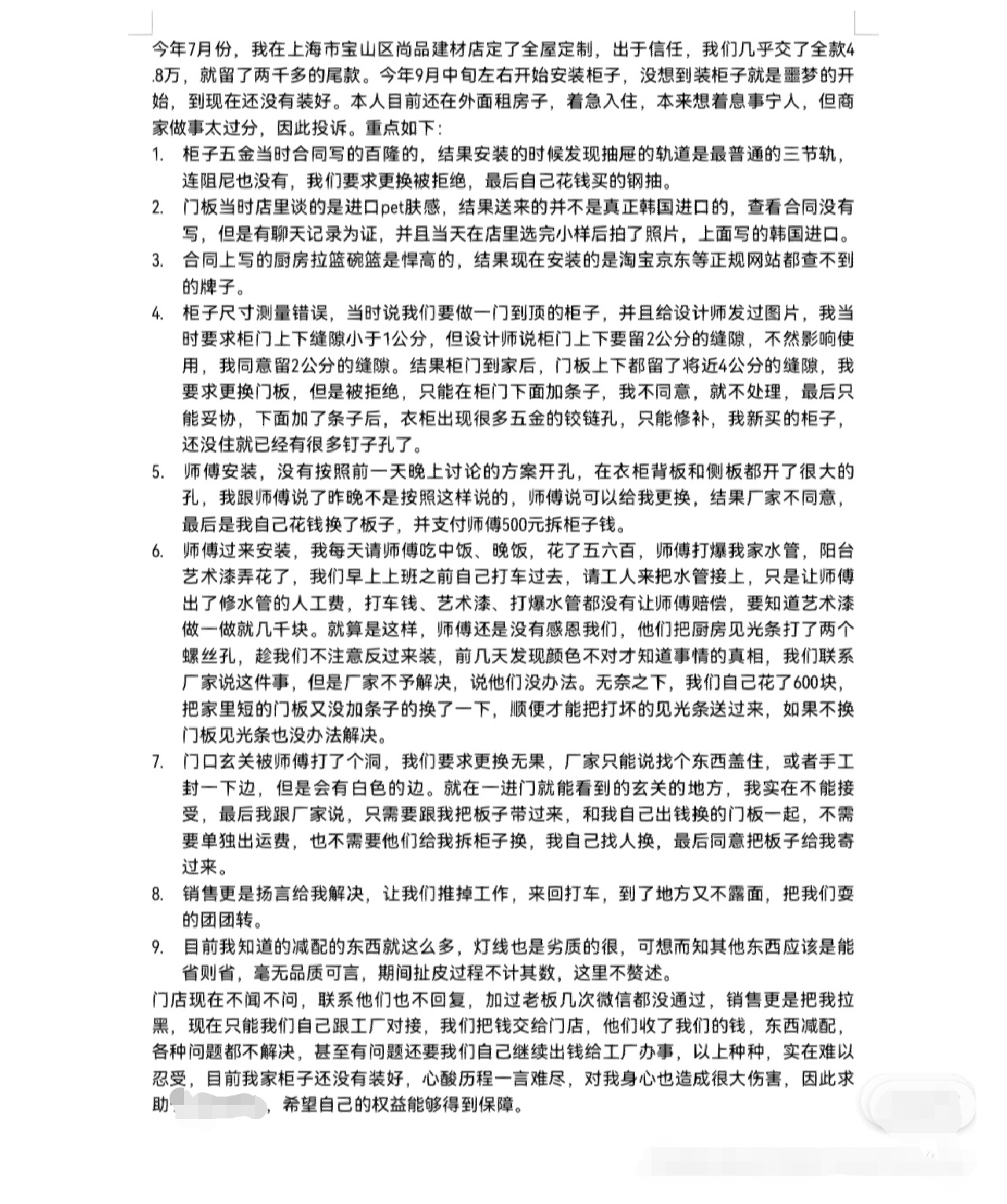 7月份我在這家工廠店定了全屋定制,后面這家老板們就把店關(guān)了只開(kāi)工廠,并且從未告知我。東西到家后,各種減配,各種問(wèn)題。這個(gè)老板忽悠我說(shuō),門店關(guān)了,錢被另外的老板抽走了,他們只是工廠,貼錢做,后面才知道他也是這家店老板之一。出了各種問(wèn)題我們要求解決,他們就不接電話,不按時(shí)裝柜子,要我們跑大半個(gè)上海去找他們安裝。白白浪費(fèi)時(shí)間。我們一步一步退,沒(méi)有換來(lái)體諒,而是變本加厲,到后面連最基本的問(wèn)題都不給解決,并且我們?cè)谒暮鲇坪驼垓v下也不敢反抗,所有要花錢的地方都要我們自己出錢搞,非常囂張,盡管這樣,我們還是得笑臉相迎。我家柜子從9月中旬開(kāi)始到現(xiàn)在還沒(méi)裝完。門板裝上去還不到一個(gè)月,就已經(jīng)沒(méi)有辦法正常開(kāi)合了。忍無(wú)可忍,決定維權(quán)。