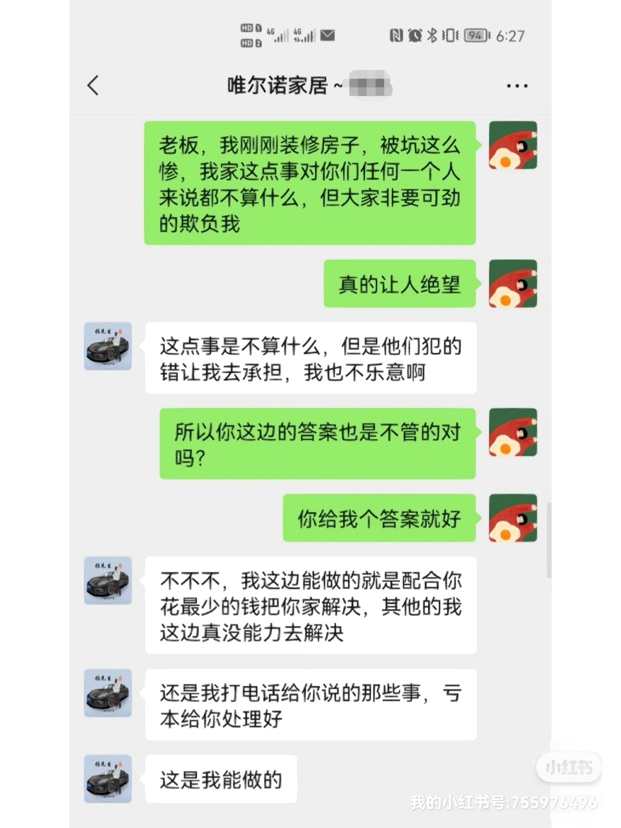 后面我拼命加另外一個(gè)老板微信(也就是門店法人),終于加上了,才得知自己一直被跟我接觸的工廠的人蒙騙,工廠的老板也是門店老板之一。但法人老板也是推卸責(zé)任,讓我妥協(xié),讓人絕望。
