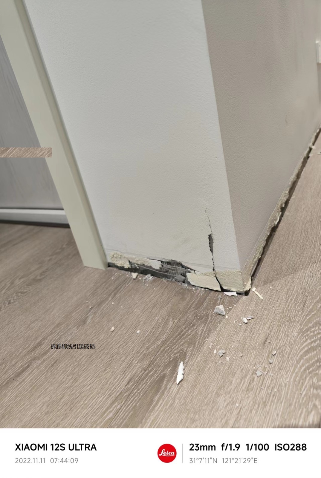 2.拆除過(guò)程中造成的損壞,如已被拆除的踢腳線、壓條,墻面損壞均需要修補(bǔ),更換;